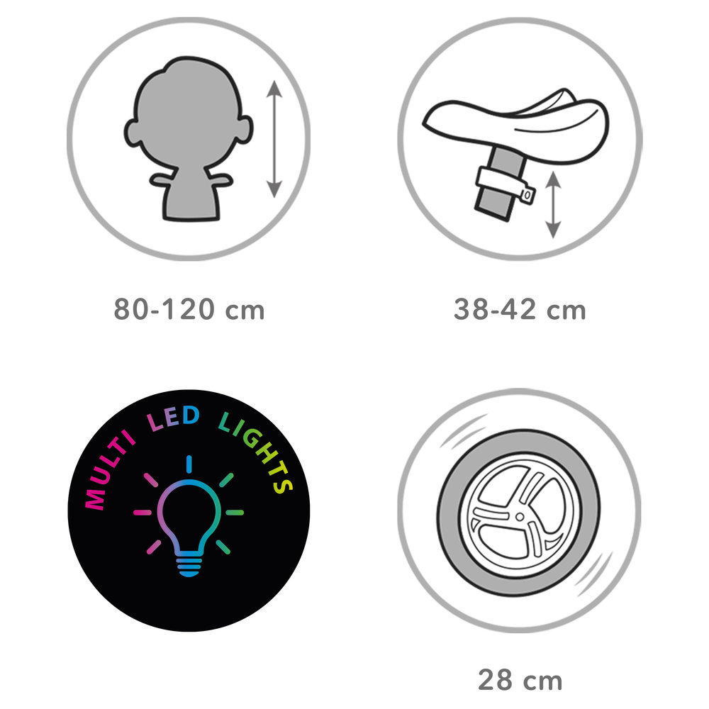 La bicicleta Suno es mucho más que un primer vehículo: es diversión, seguridad y estilo para los más pequeños. Su sistema de hasta 20 modos de iluminación LED multicolor no solo convierte cada paseo en una experiencia llena de magia, sino que también aumenta la visibilidad del niño, especialmente al anochecer.