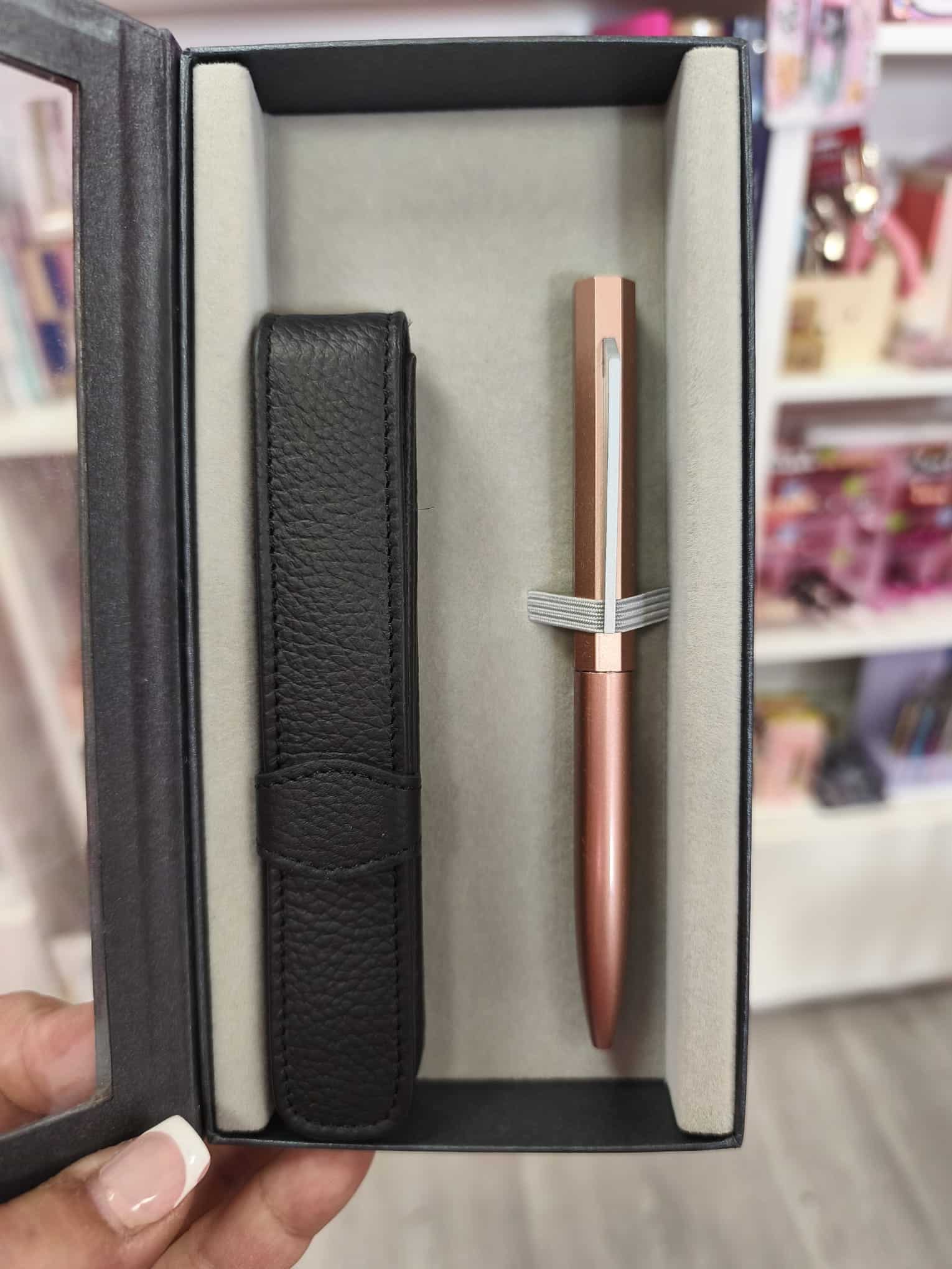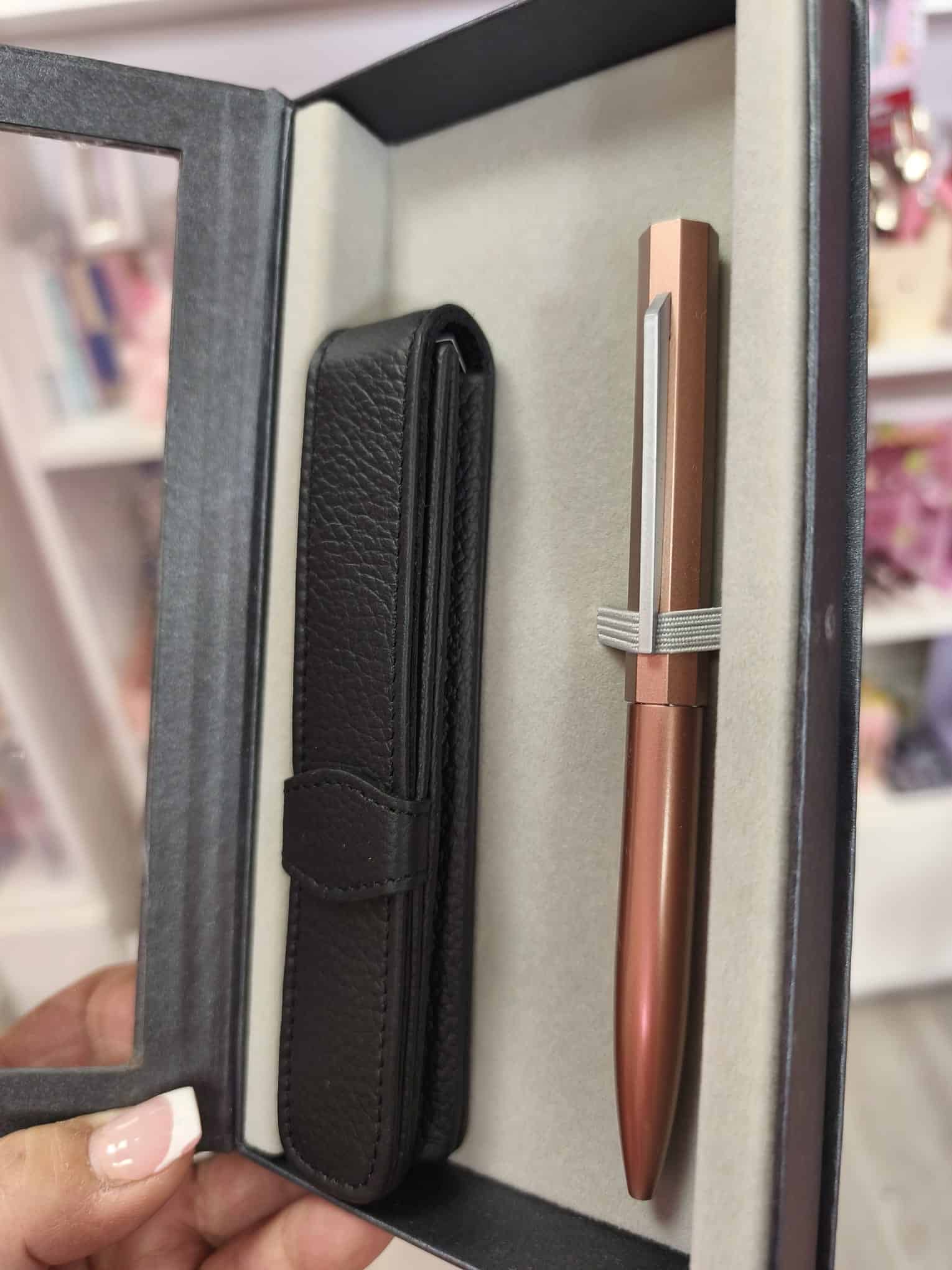 Bolígrafo de metal con acabado en color rosa dorado.