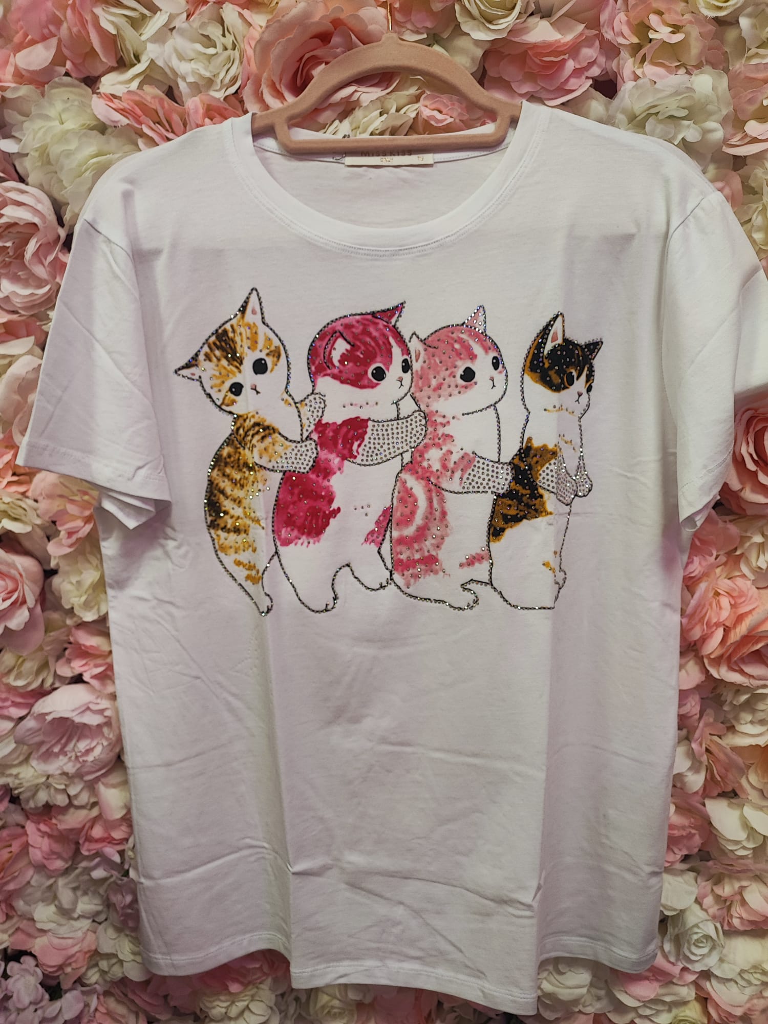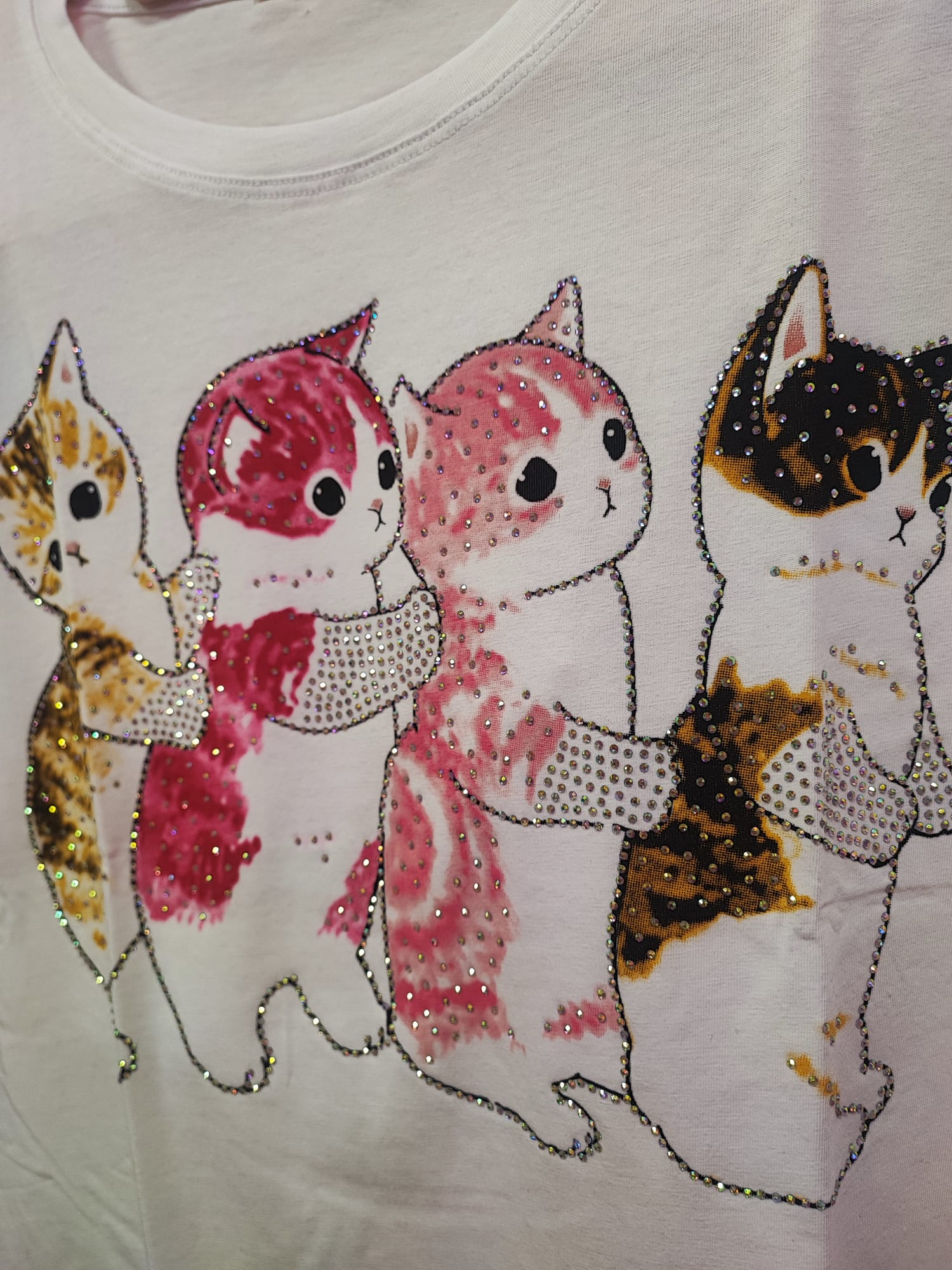 Esta camiseta blanca presenta un precioso diseño de gatitos Mofusands, conocidos por su estilo adorable y kawaii. Los cuatro gatitos aparecen abrazados en un diseño lleno de color, con detalles de pedrería brillante que hacen que la camiseta tenga un toque especial y muy llamativo.