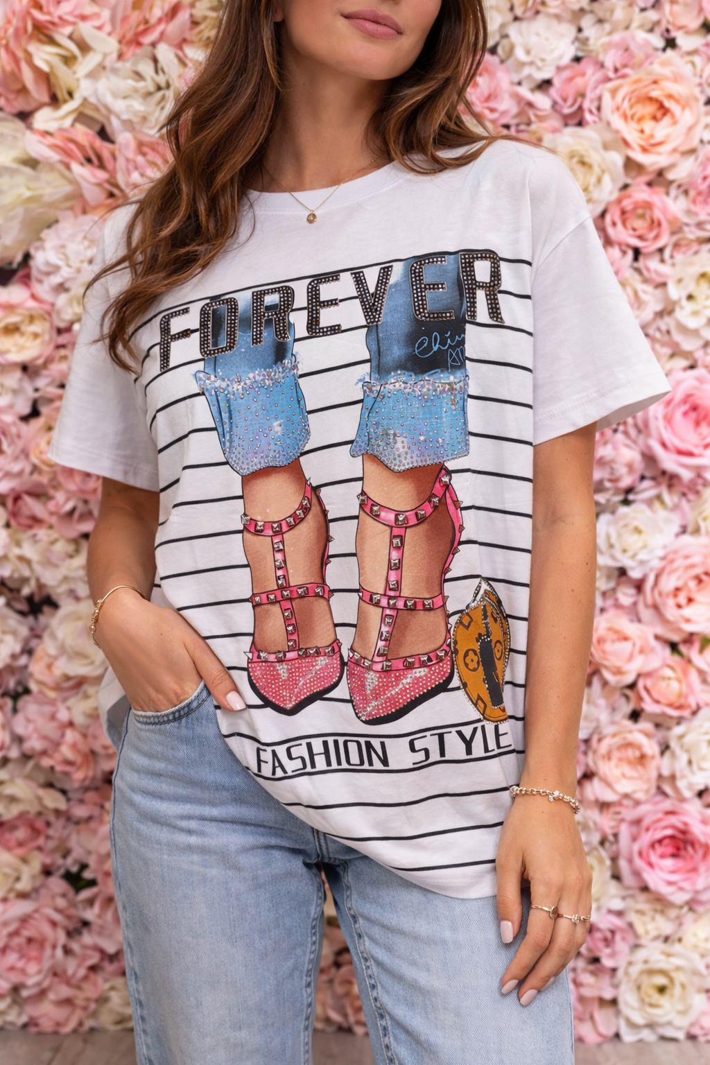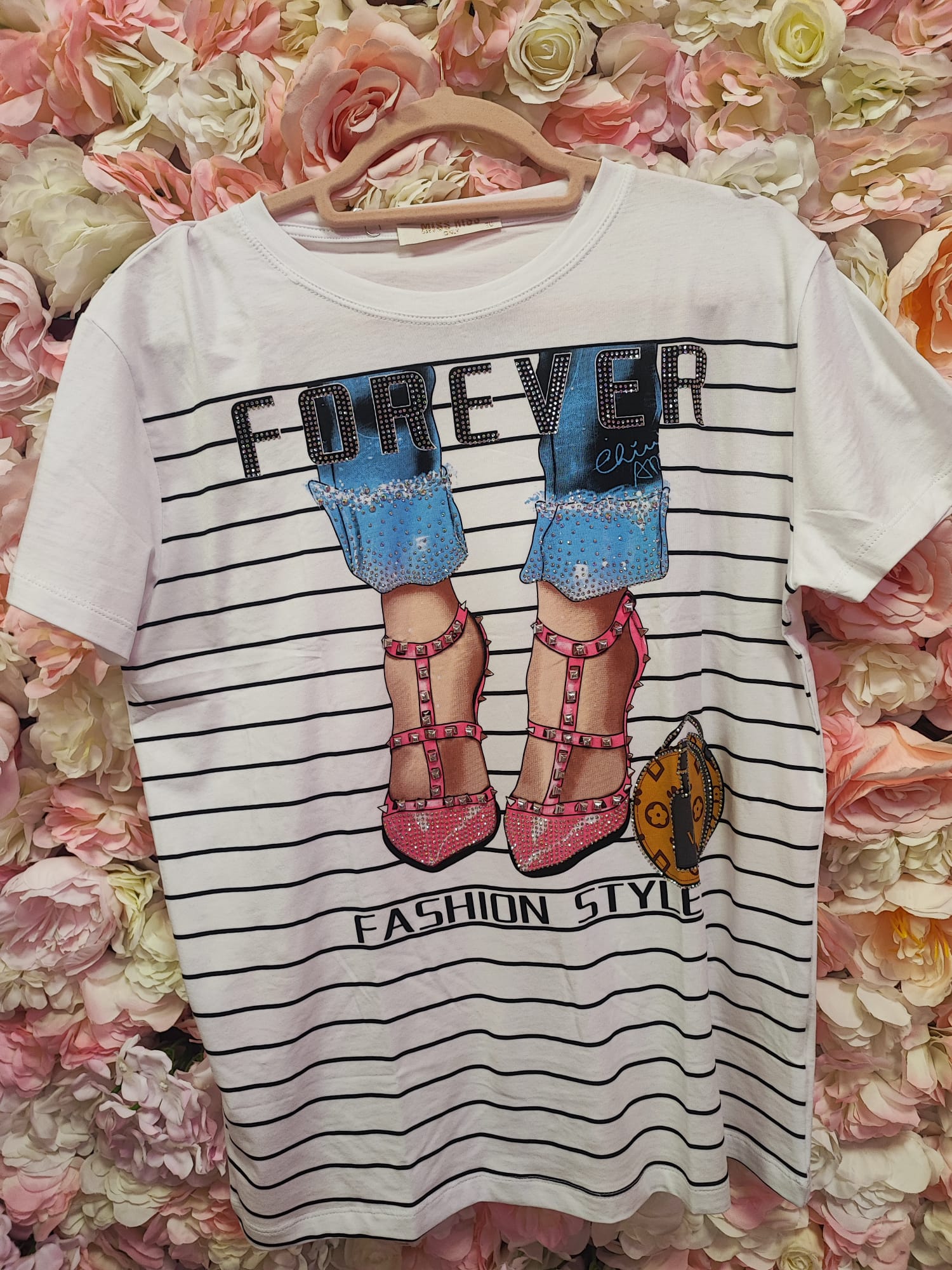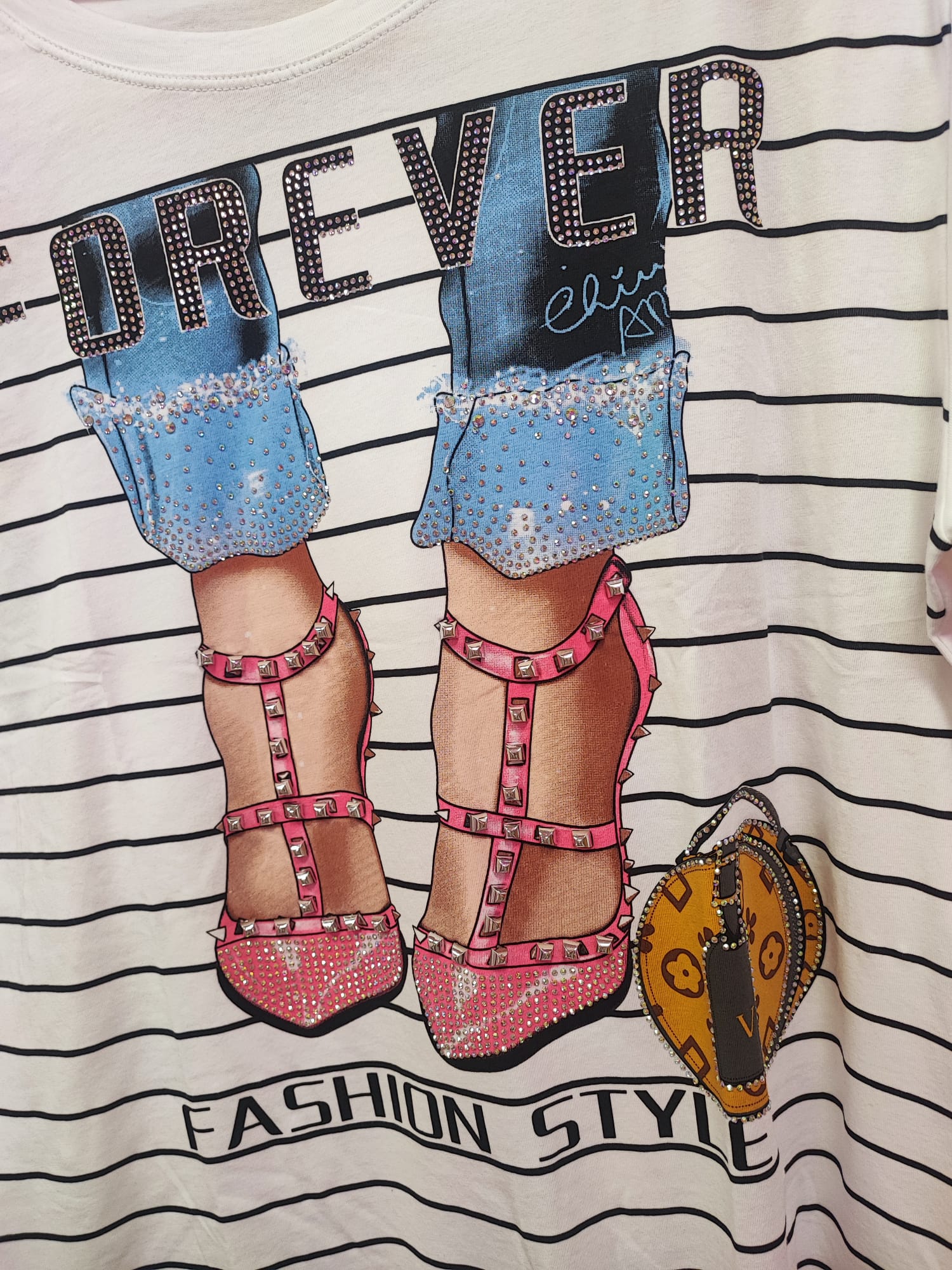 Esta camiseta blanca de rayitas finas destaca por su diseño “FOREVER” con letras llenas de brillis, que aportan un efecto luminoso y elegante. El dibujo muestra unas piernas con vaqueros y tacones rosas decorados con tachuelas, un detalle muy original que le da un aire fashion y moderno.