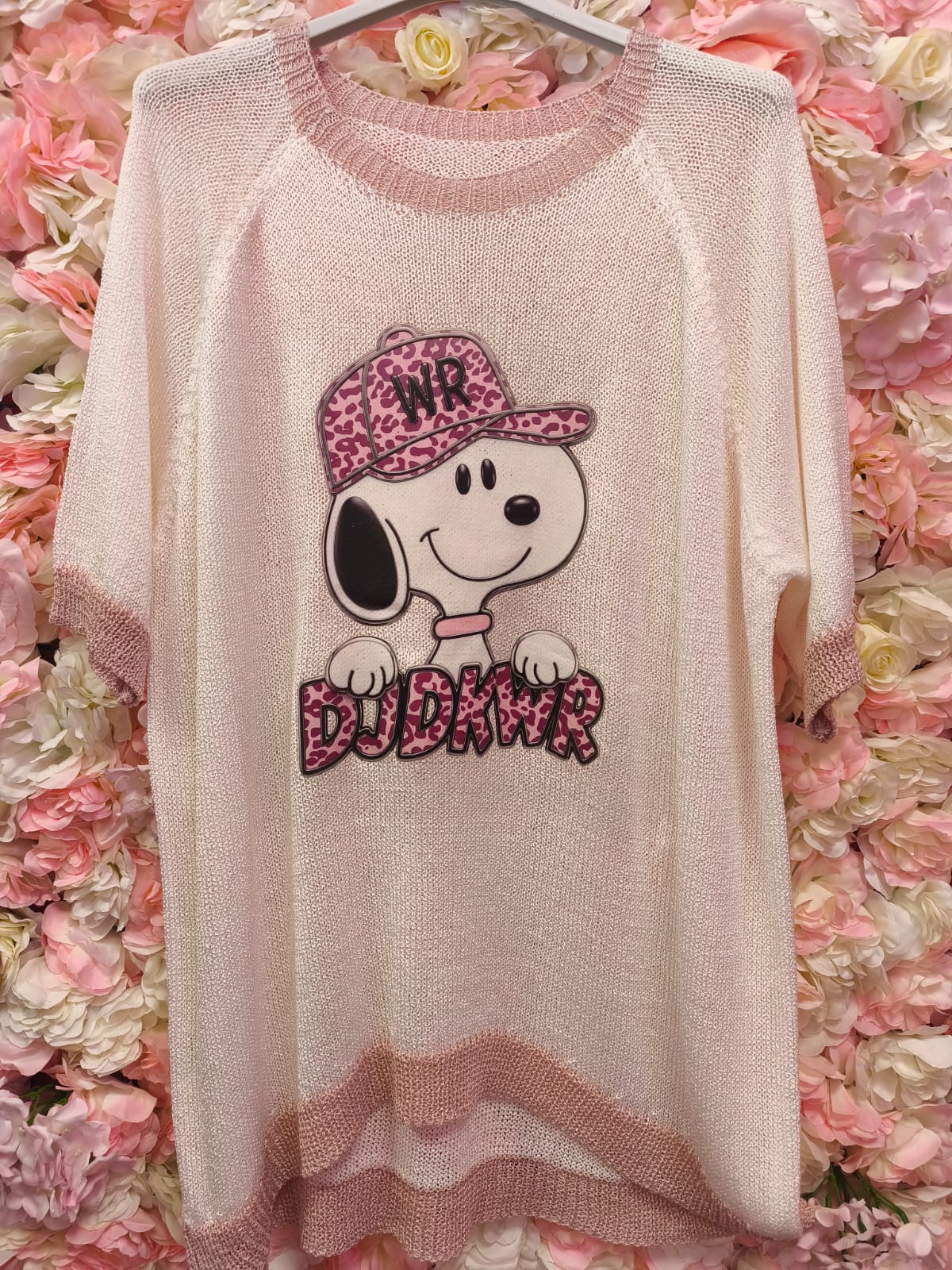 Una prenda ideal para darle un toque dulce y original a tus looks 💕. Esta camiseta de punto fino combina comodidad y estilo con un diseño encantador de Snoopy en tonos rosa.