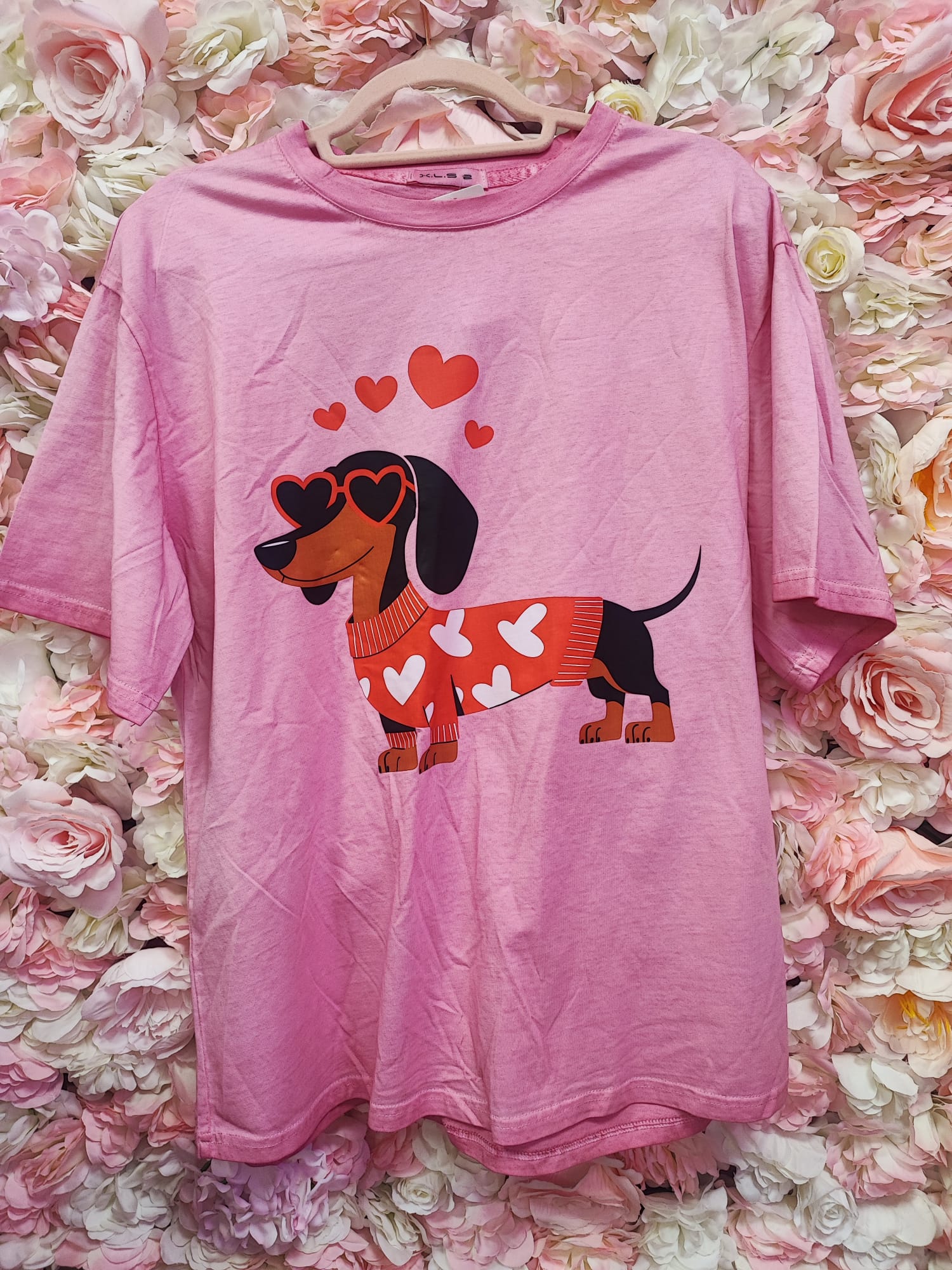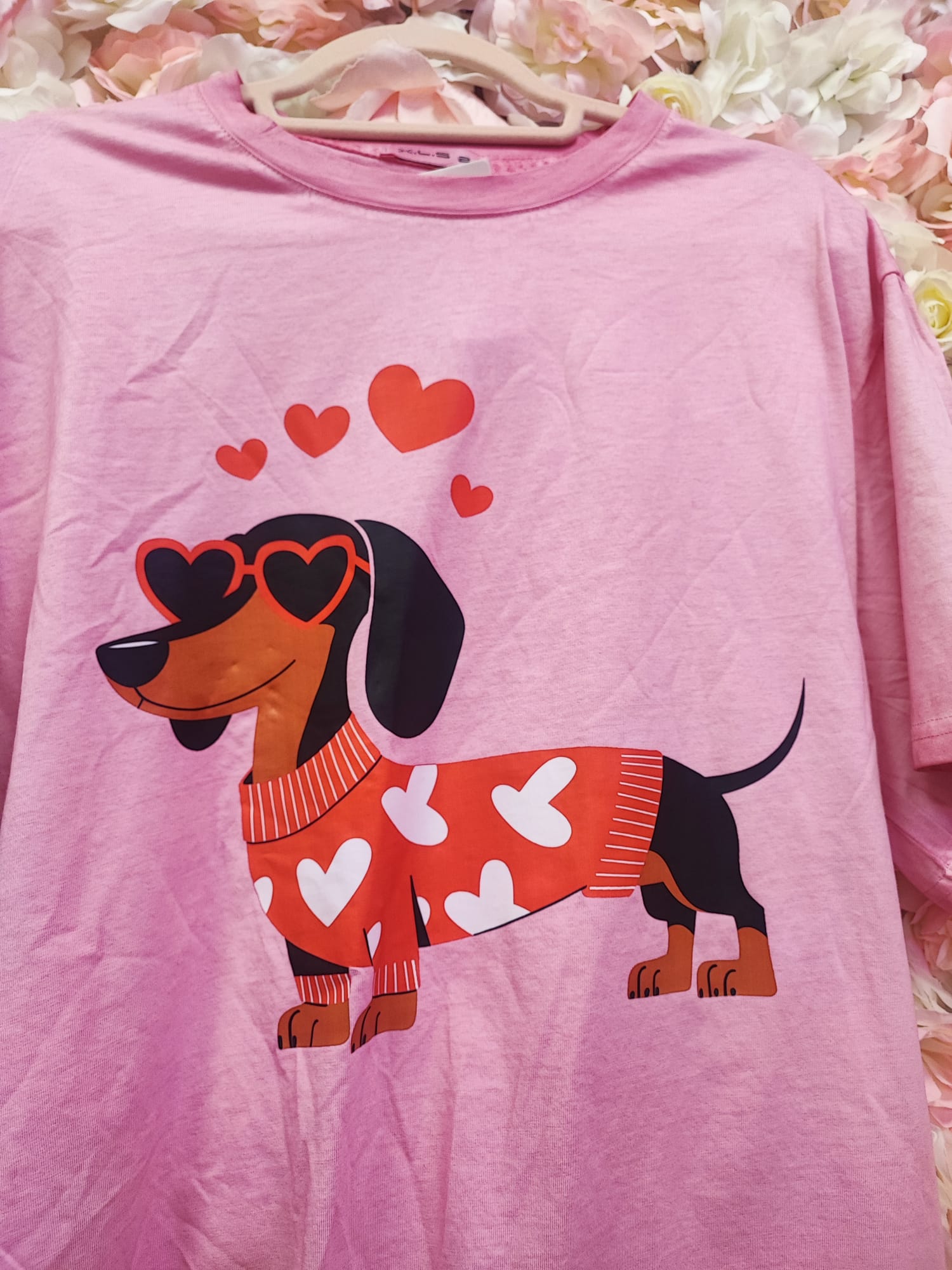 Nuestra camiseta rosa presenta un adorable perrito salchicha con gafas de corazón y jersey lleno de corazones, un diseño alegre y lleno de amor que no pasa desapercibido.