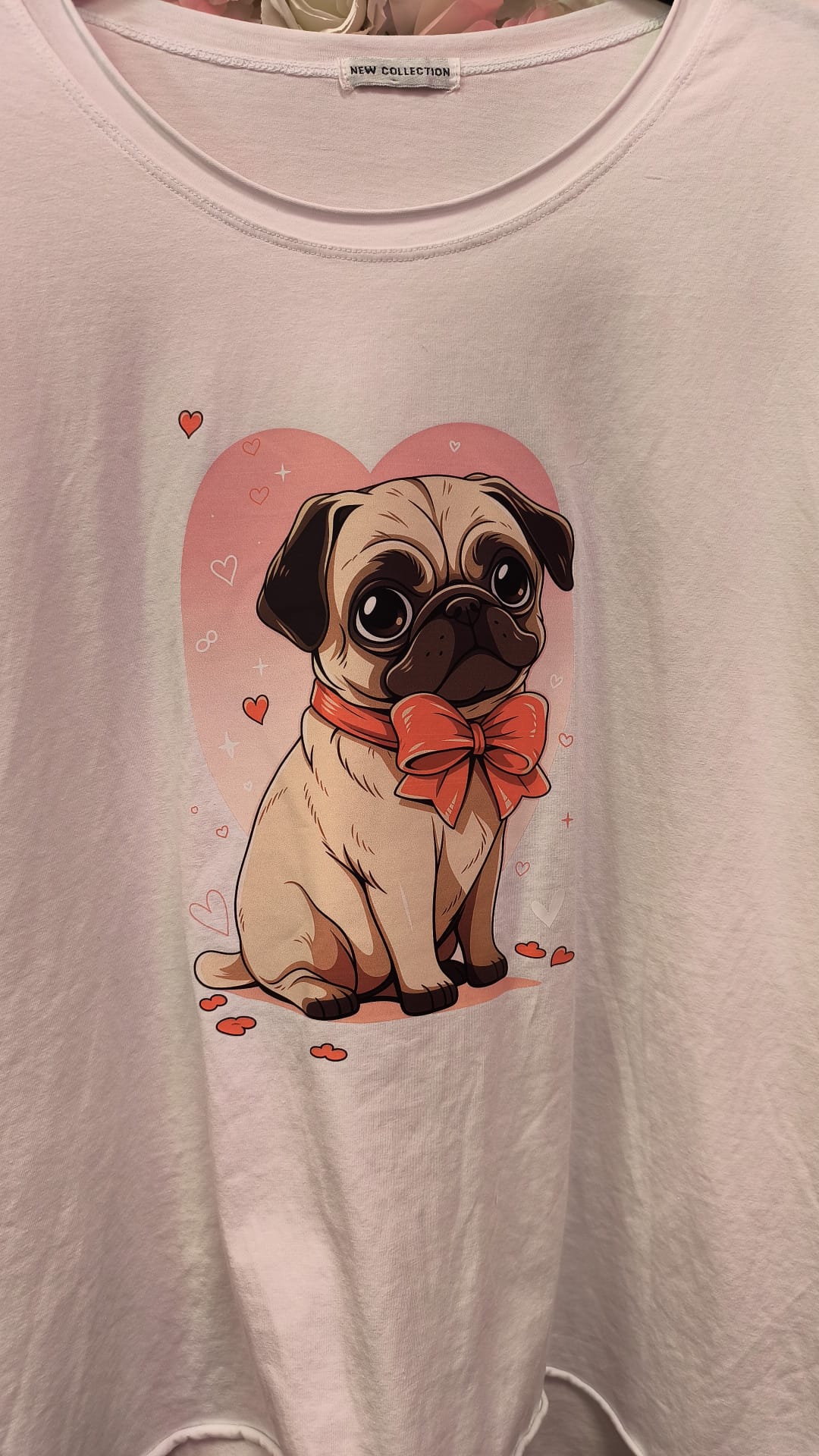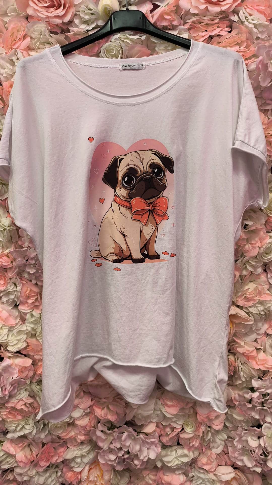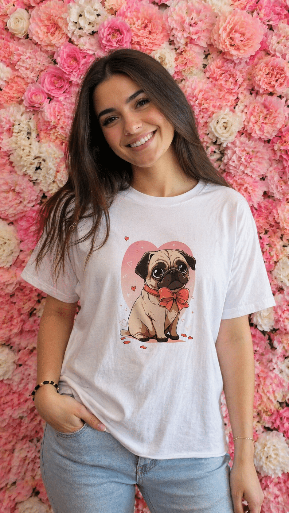 Dale un toque dulce y adorable a tu look con esta camiseta de diseño encantador. Su estampado de perrito con lazo sobre fondo de corazones la convierte en una prenda perfecta para quienes aman los detalles especiales y originales.