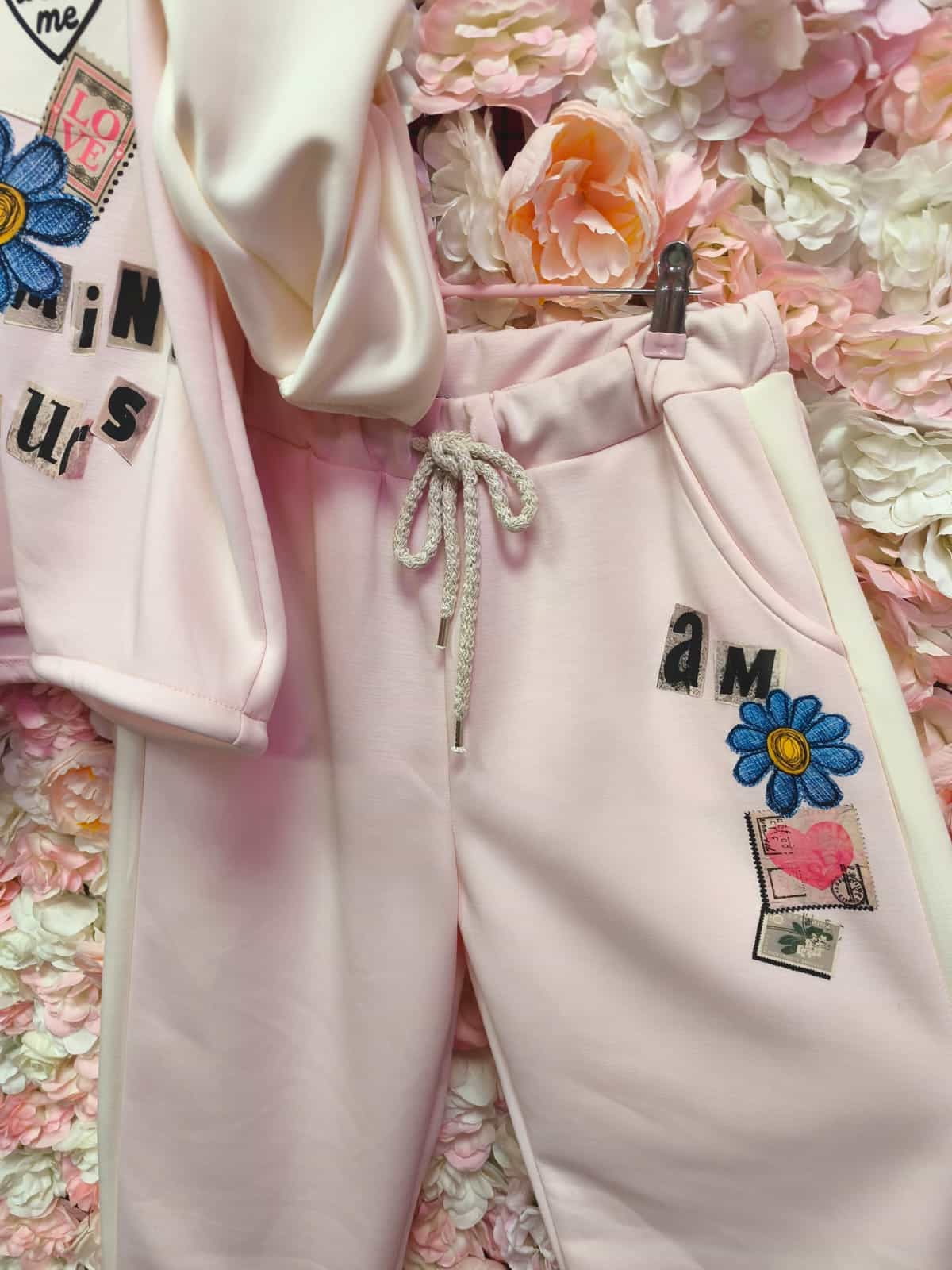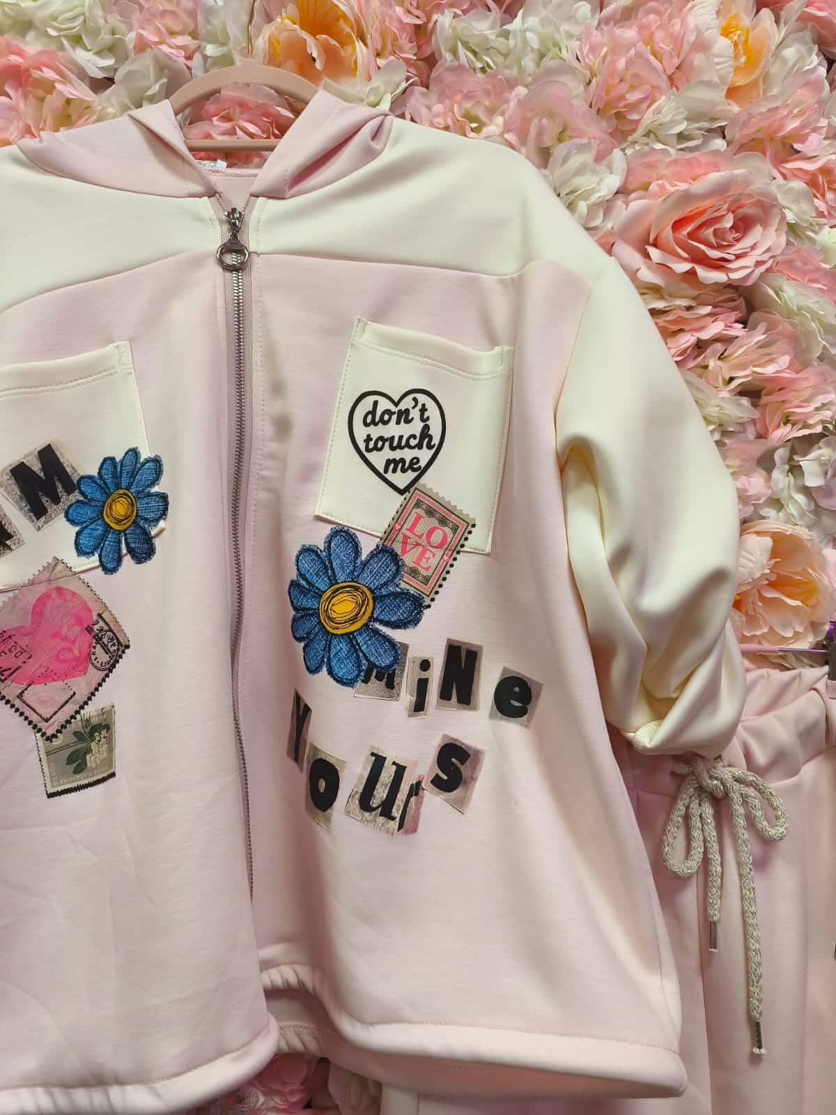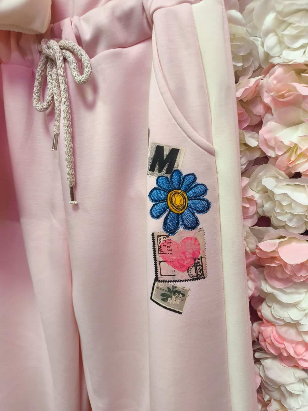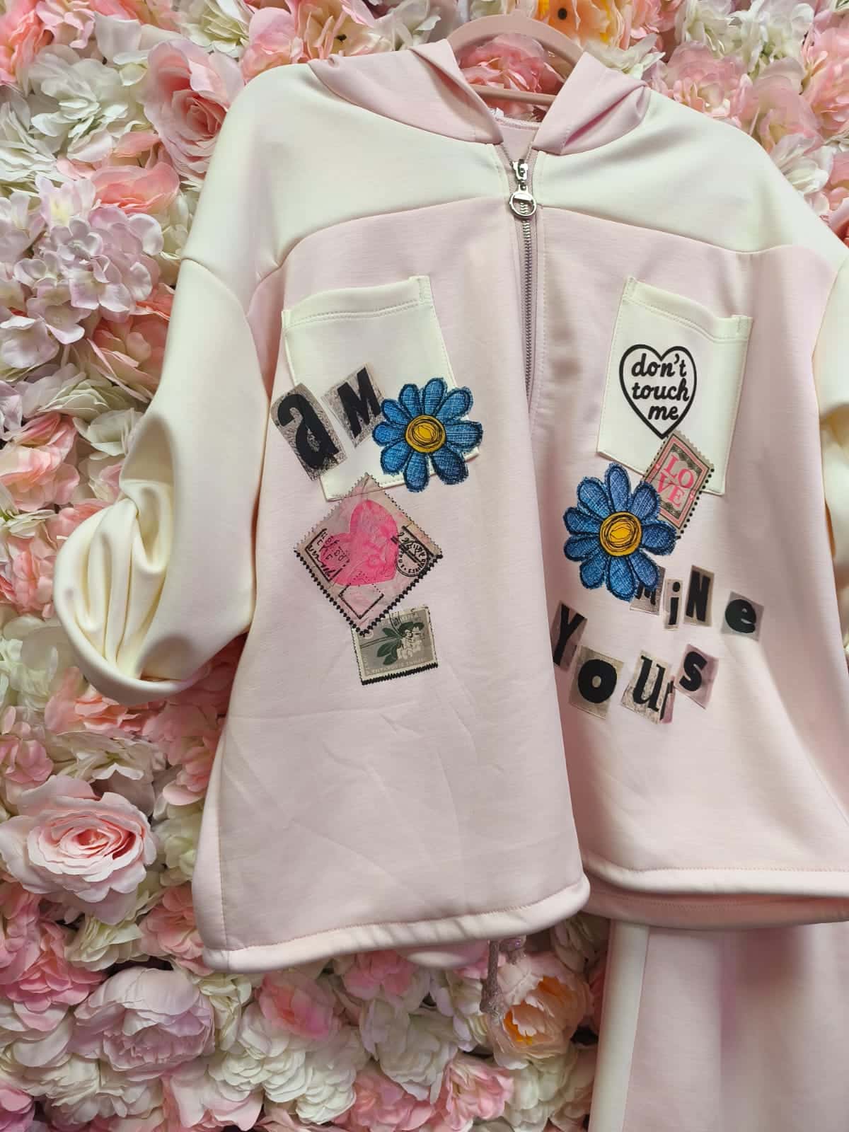 Este chándal de marca Milano destaca por su estilo dulce y original, con aplicaciones tipo patchwork, flores bordadas y mensajes decorativos que lo hacen único.