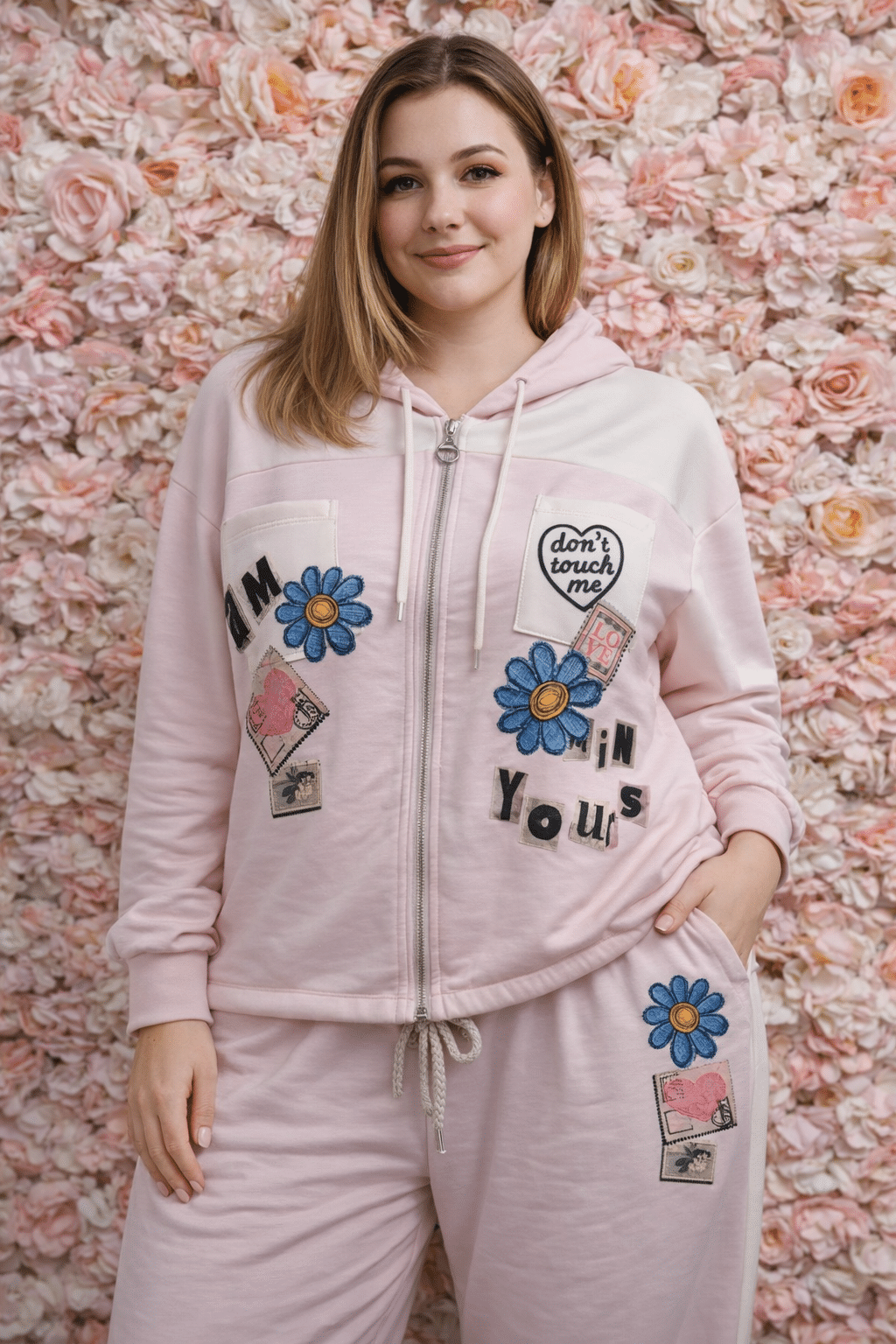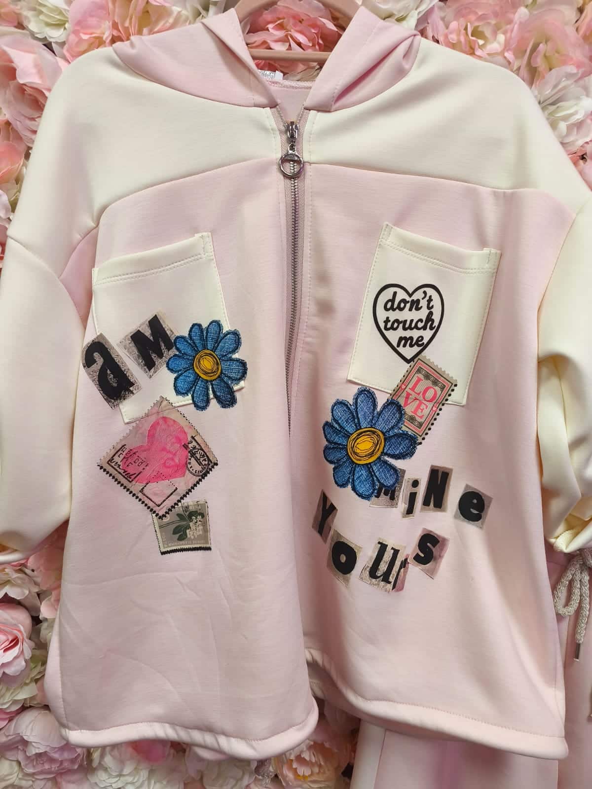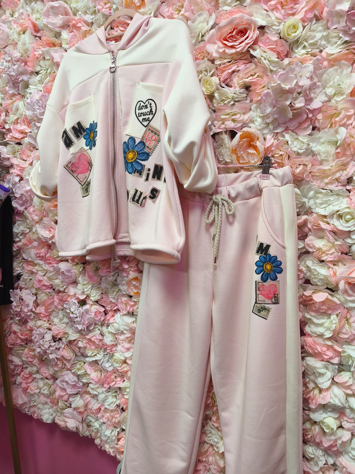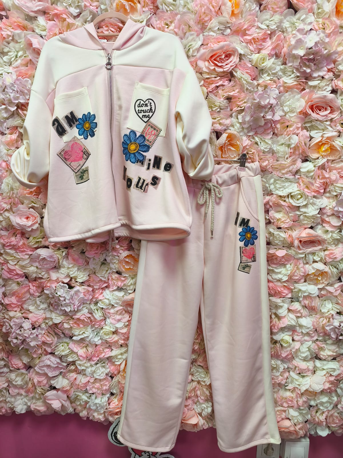 Este chándal de marca Milano destaca por su estilo dulce y original, con aplicaciones tipo patchwork, flores bordadas y mensajes decorativos que lo hacen único.