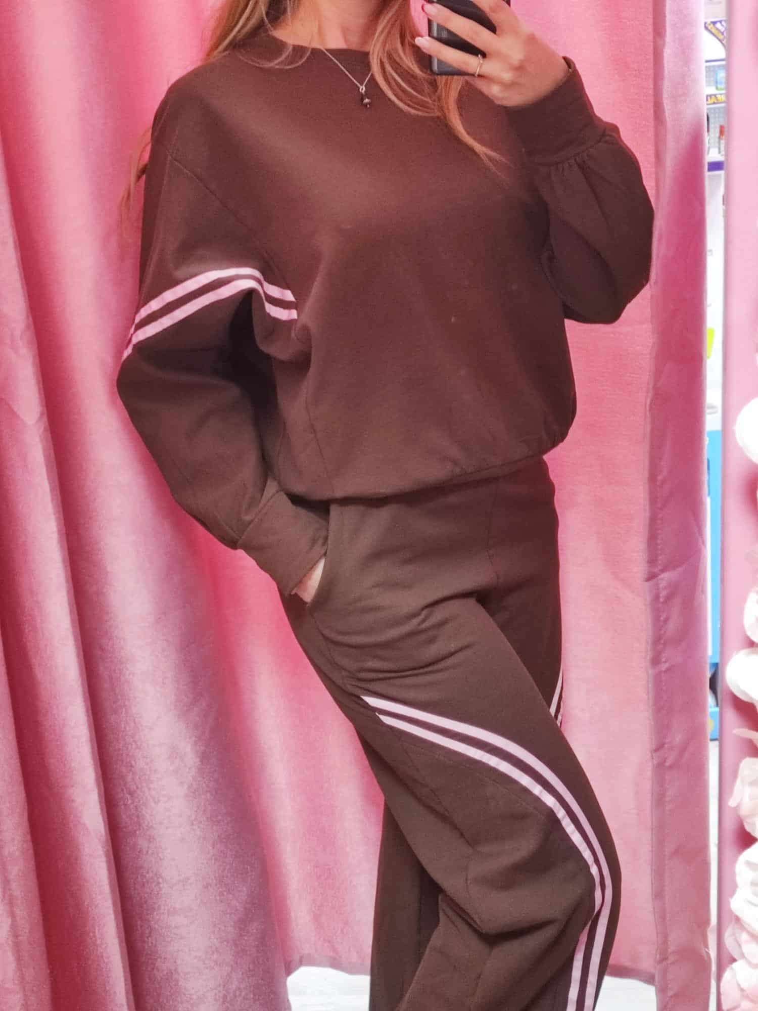 Comodidad, estilo y un toque sporty-chic. Este chándal de dos piezas es ideal para tu día a día gracias a su tejido suave, ligero y muy agradable al tacto. El conjunto incluye sudadera de corte relajado y pantalón con cintura elástica, ofreciendo máxima comodidad y libertad de movimiento.