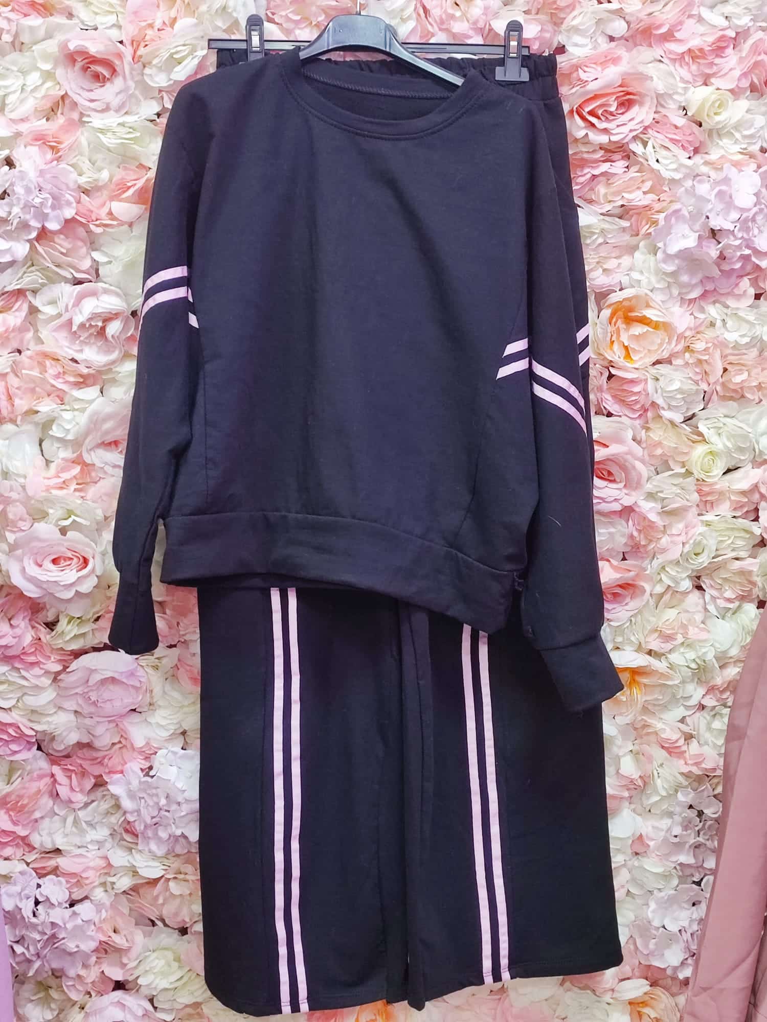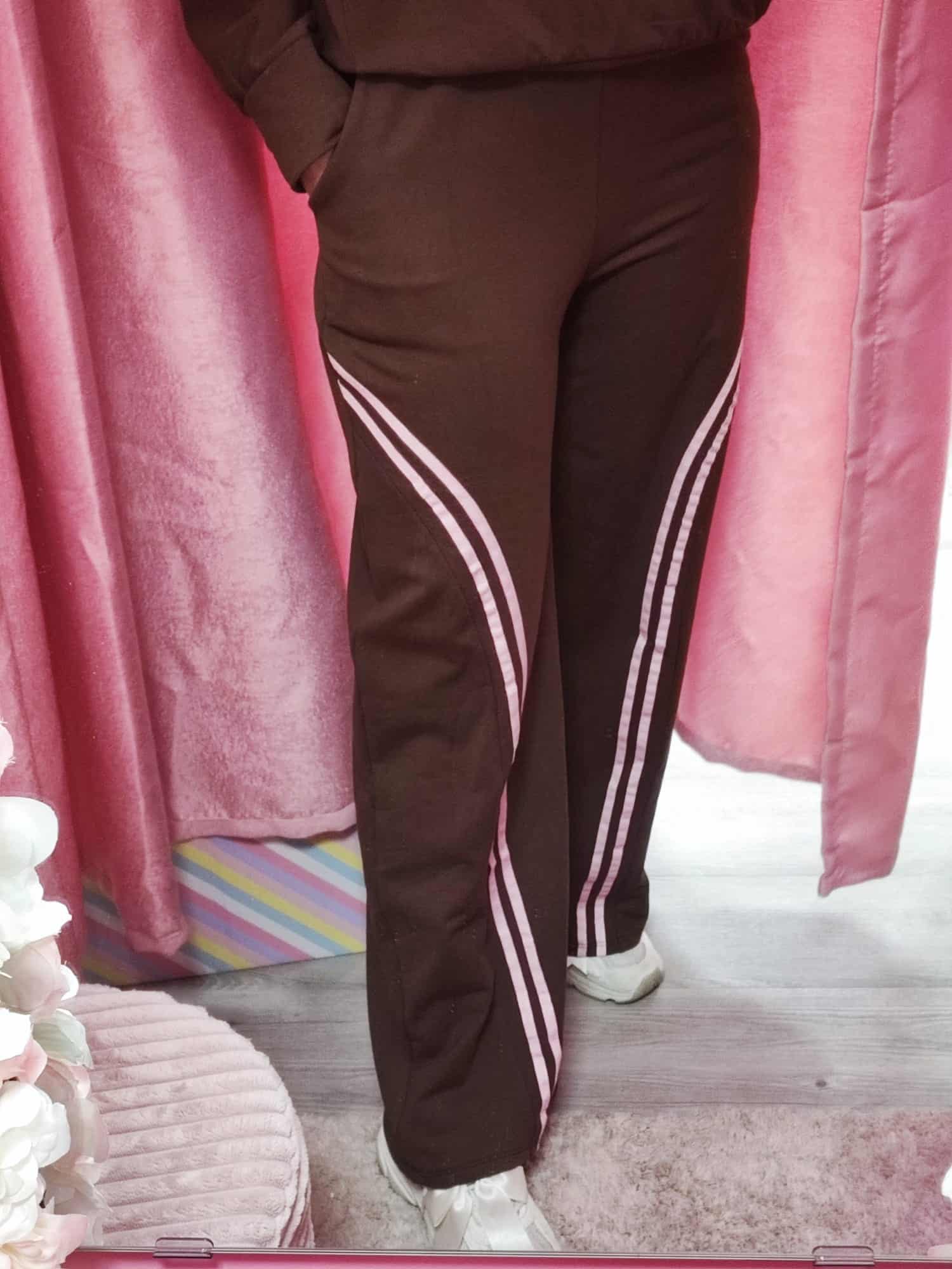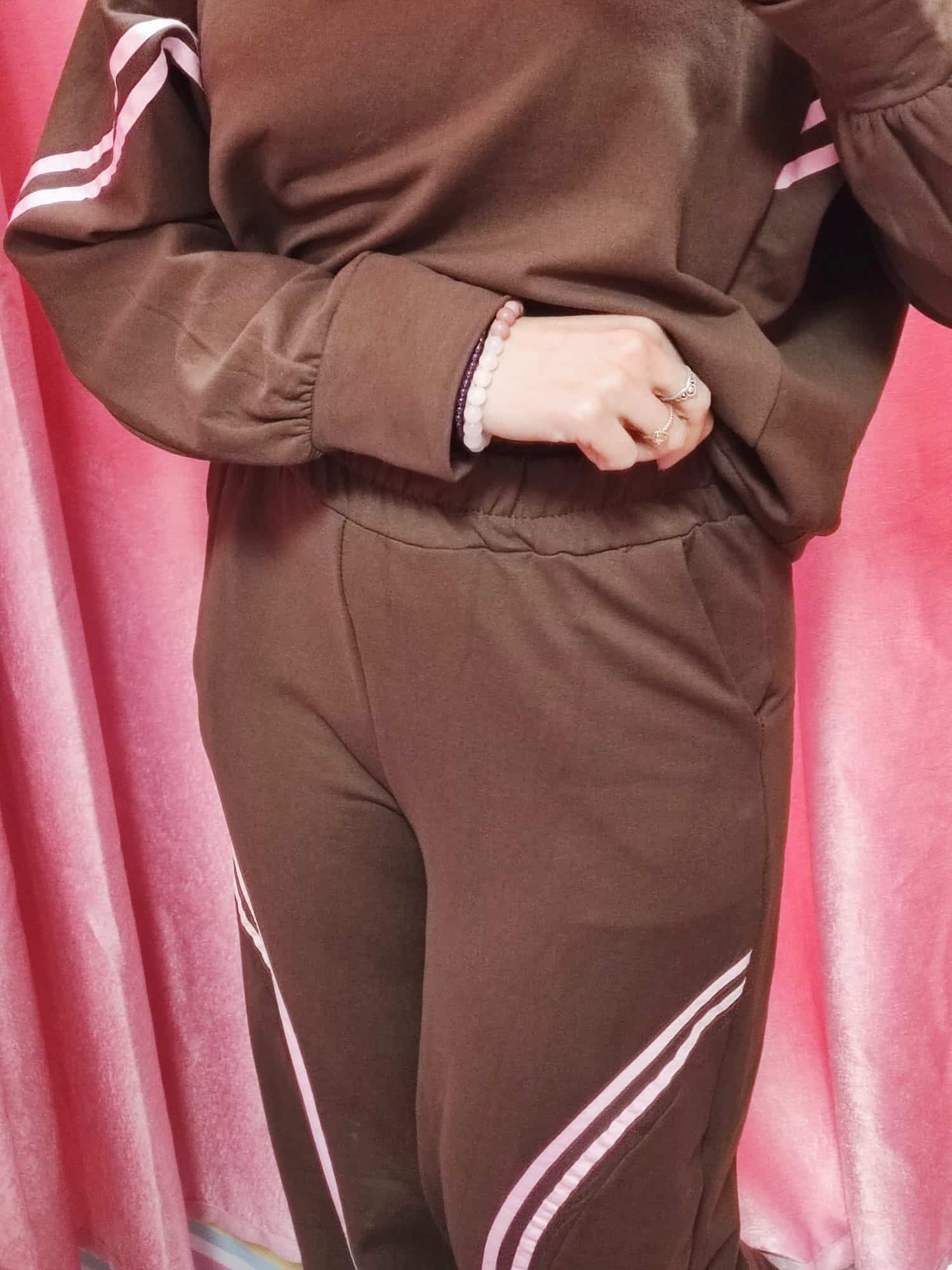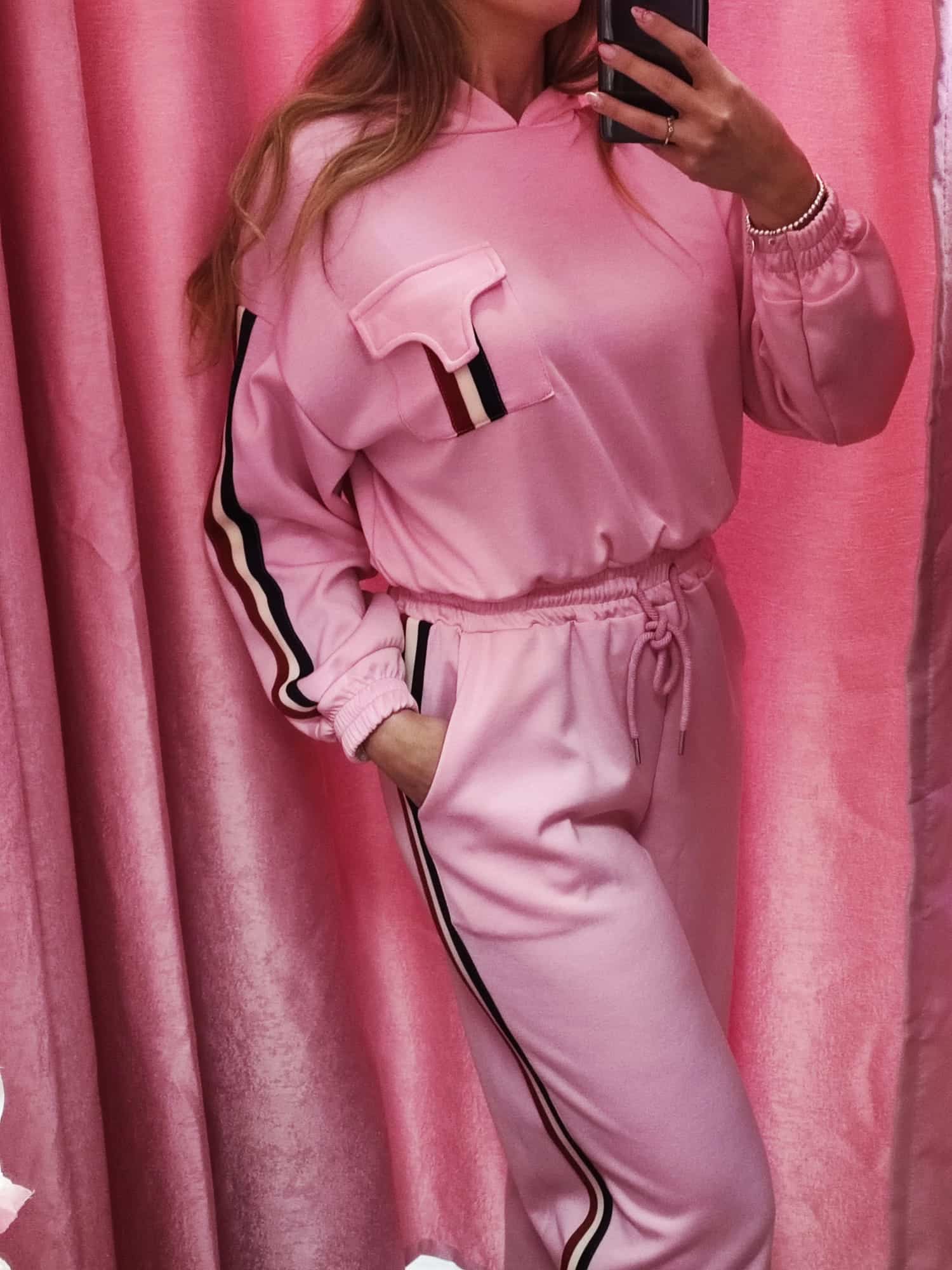Las líneas rosas en mangas y perneras le dan un toque femenino y moderno que estiliza la silueta y lo hace diferente a un chándal básico.