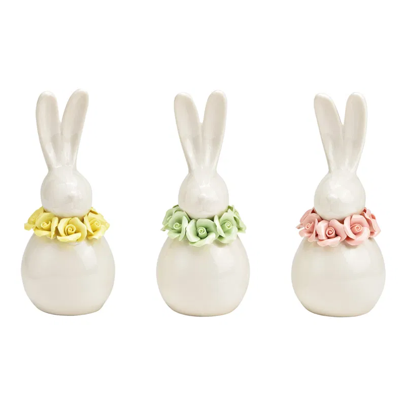Decora tu hogar con este elegante conejito de porcelana blanca, un detalle delicado y lleno de encanto. Su diseño minimalista se realza con una preciosa corona de flores en relieve, disponible en amarillo, verde o rosa (color a elegir).