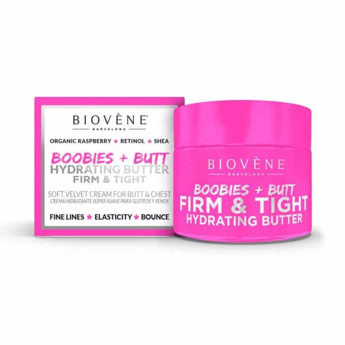 Manteca corporal ultrahidratante para glúteos y senos con frambuesa orgánica rica en antioxidantes, retinol y karité para ayudar a mejorar la textura de la piel, recuperar la elasticidad y minimizar la aparición de líneas finas y arrugas con una piel más firme y tersa.