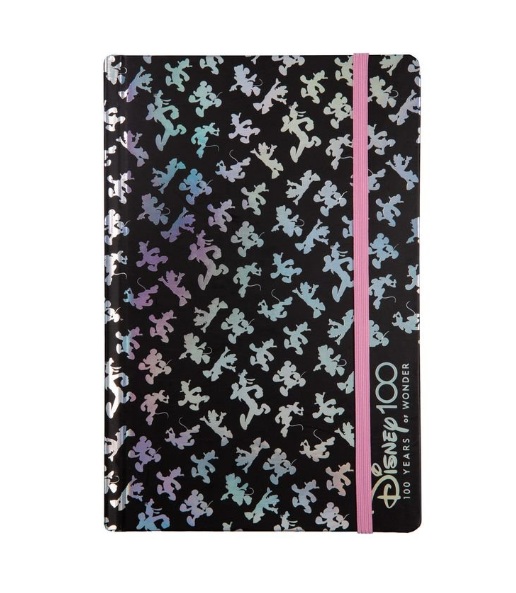 La portada negra está decorada con múltiples siluetas de Mickey Mouse con efecto iridiscente, que cambian de color según la luz, creando un acabado moderno y muy llamativo. Incluye una banda elástica rosa para mantener el cuaderno cerrado y proteger tus notas.
