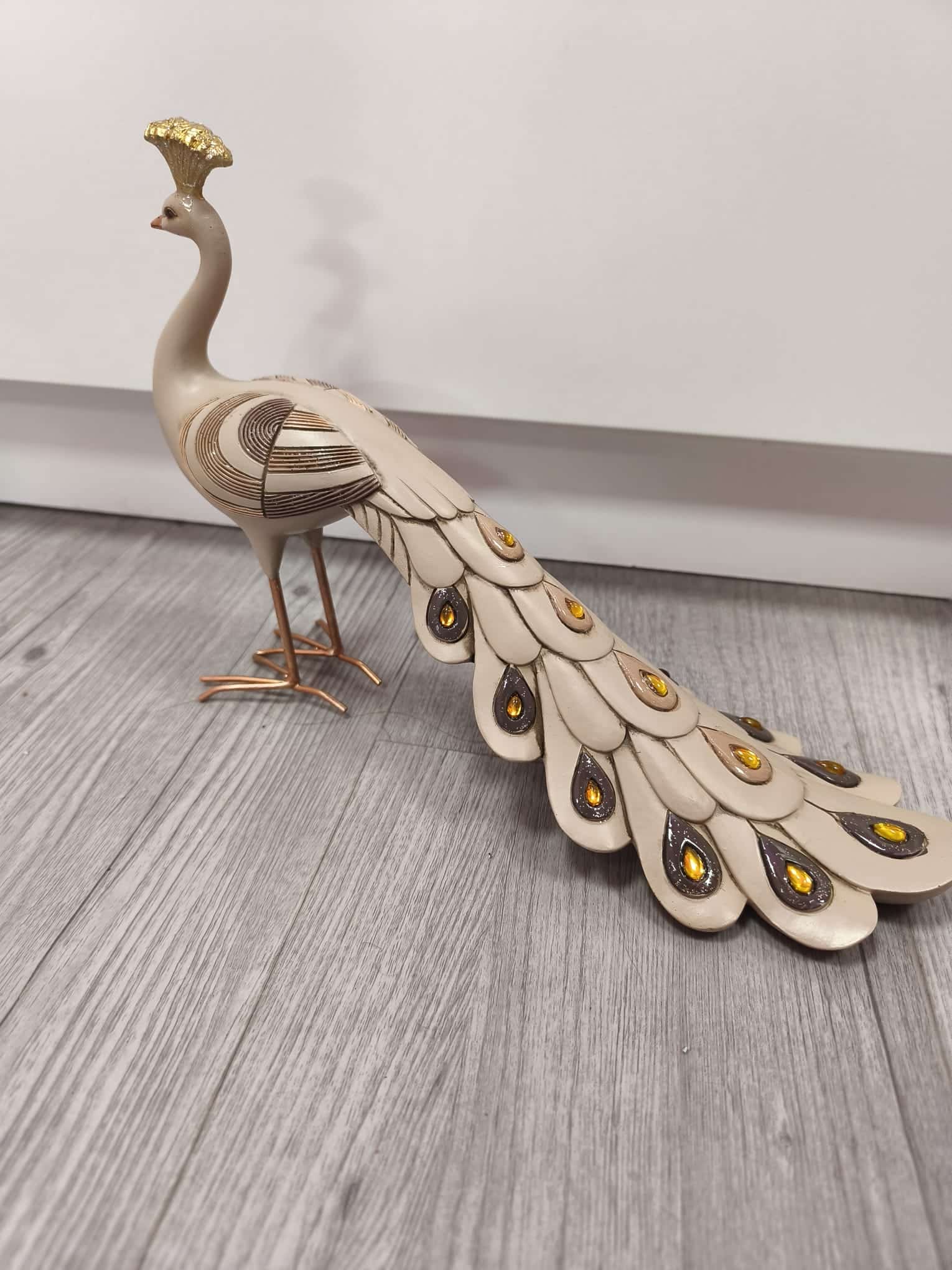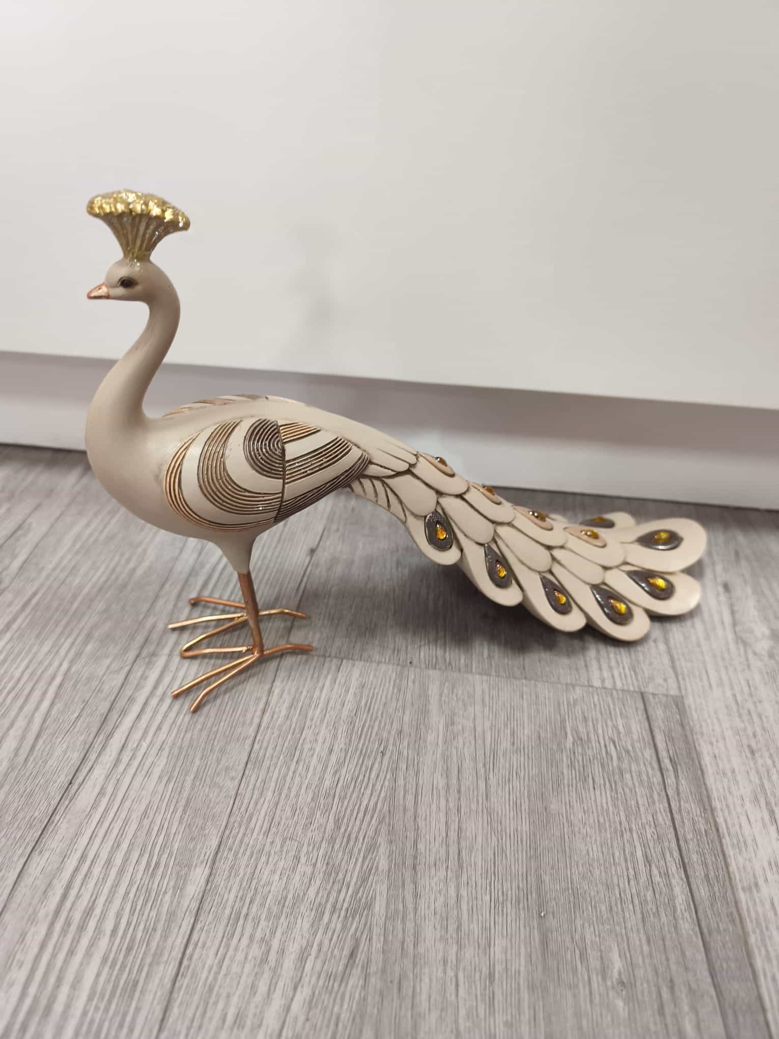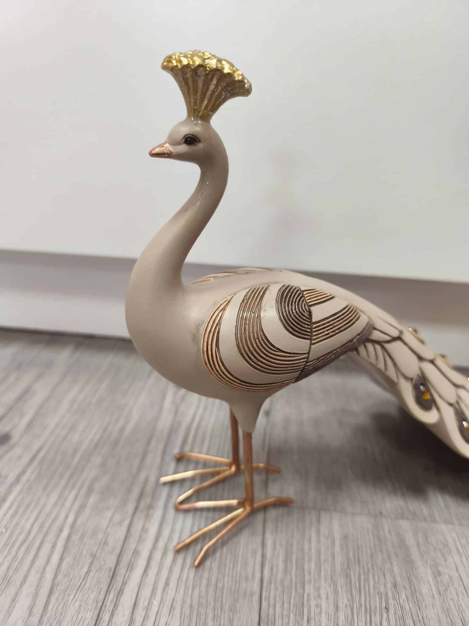 Aporta sofisticación y estilo a tu hogar con esta preciosa figura de pavo real. Su diseño refinado destaca por los delicados detalles en relieve y su elegante cola decorada con acabados brillantes en tonos dorados y ámbar, que captan la luz y aportan un toque exclusivo.