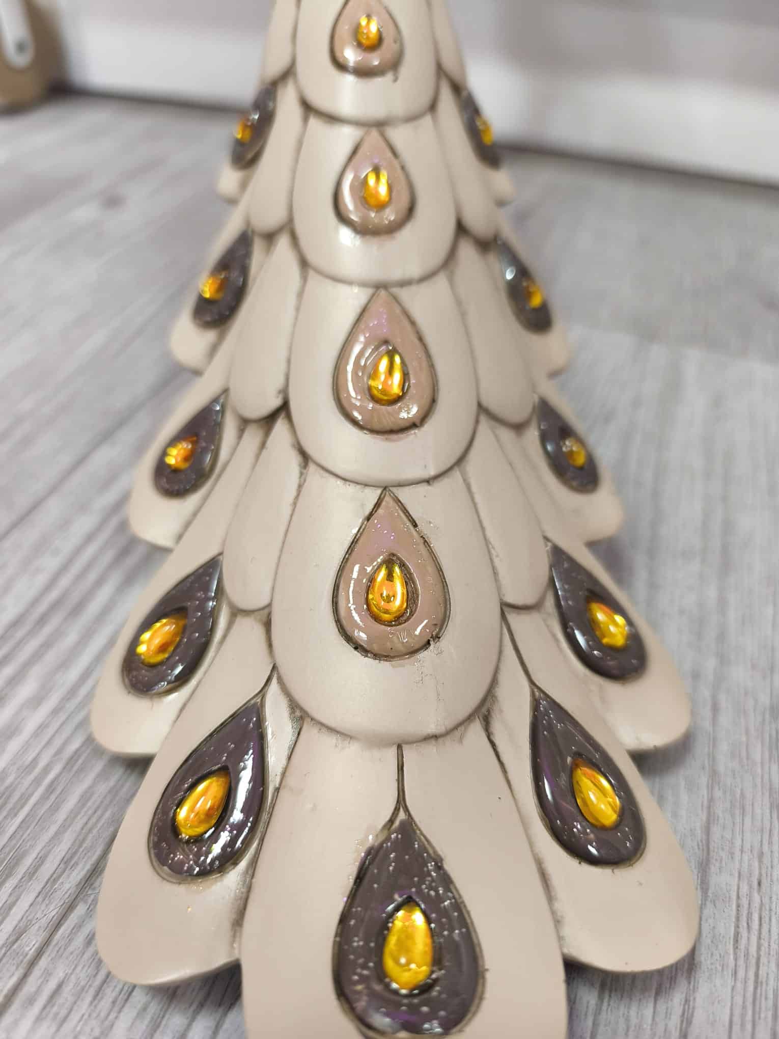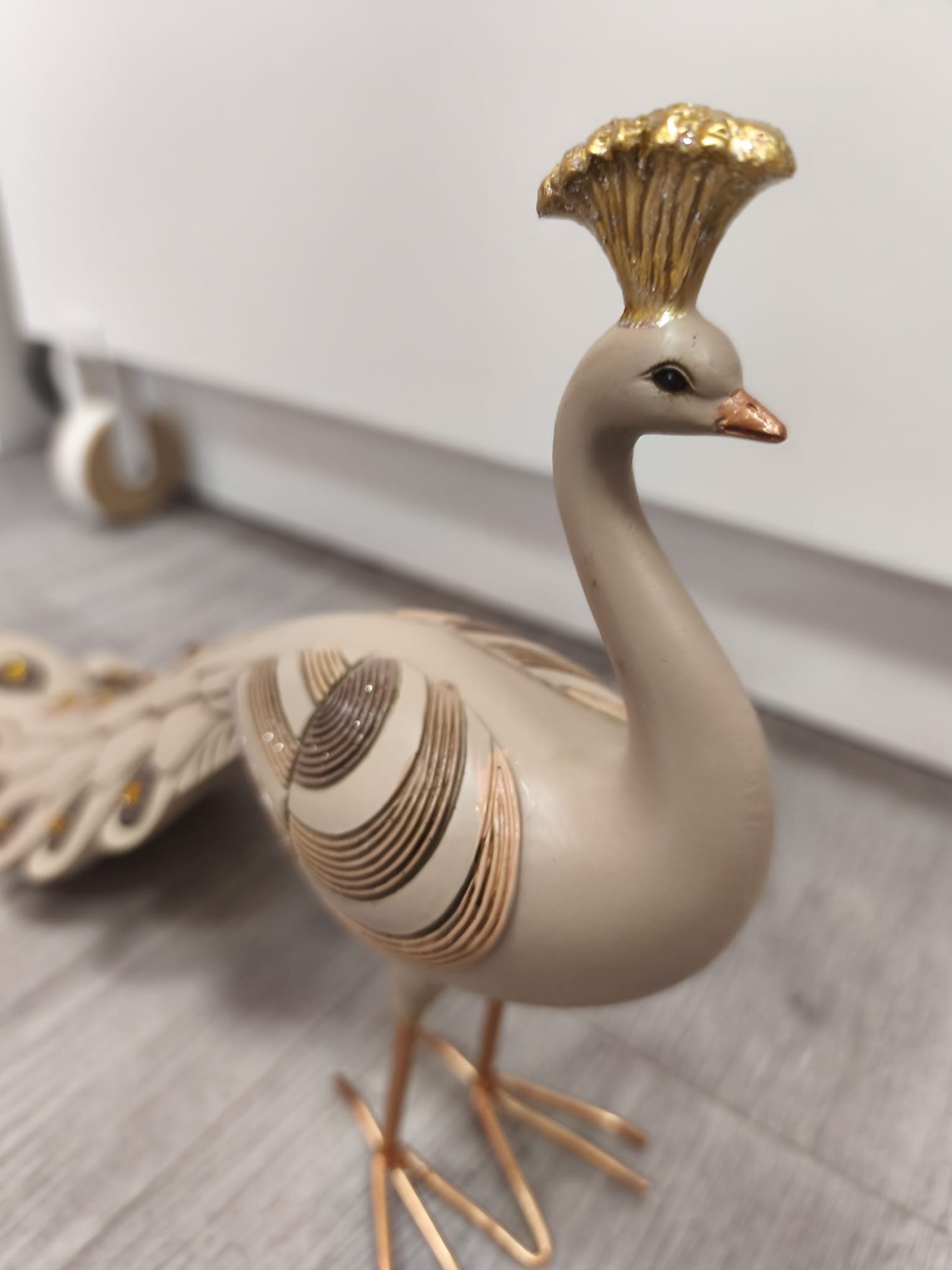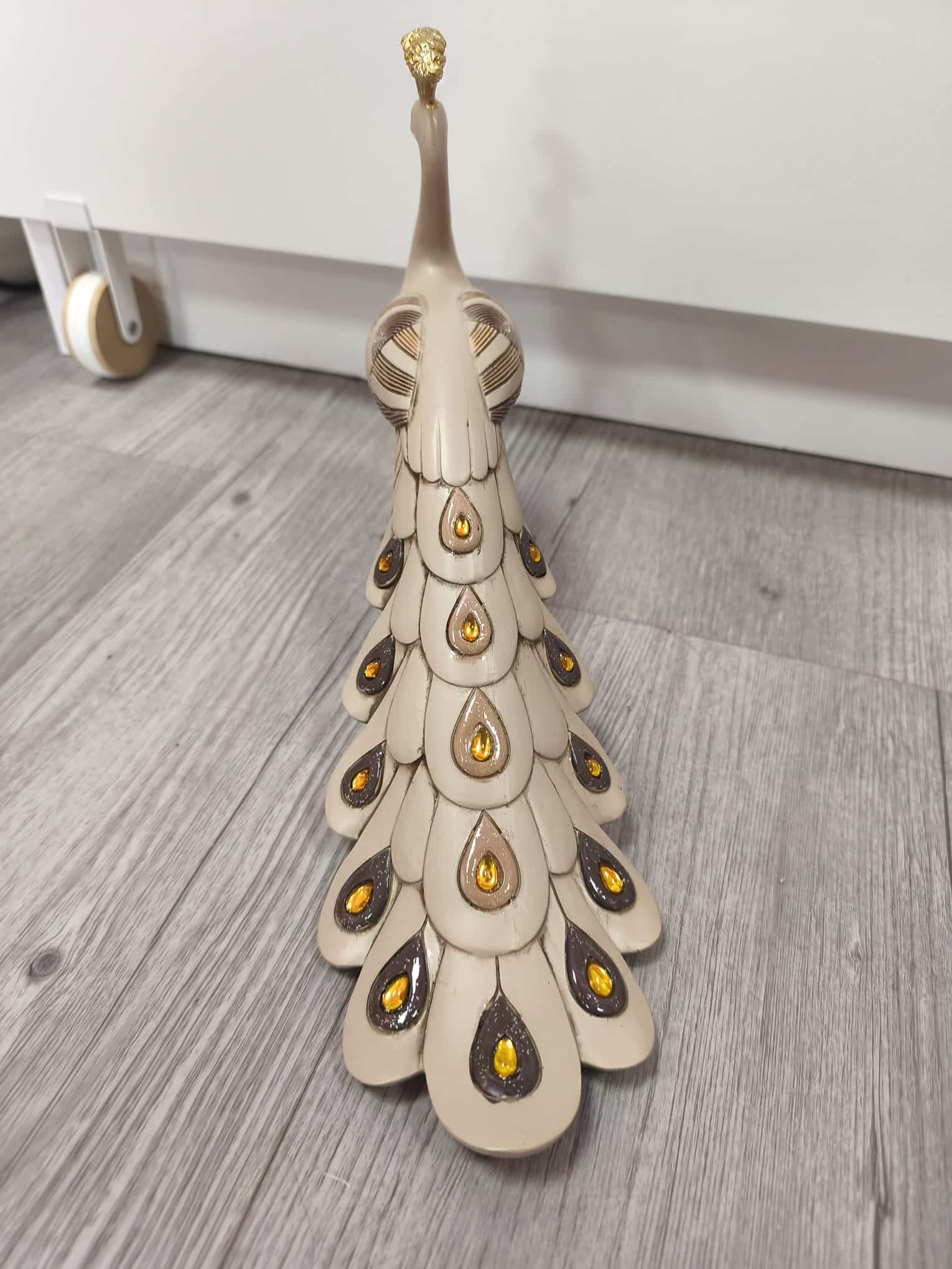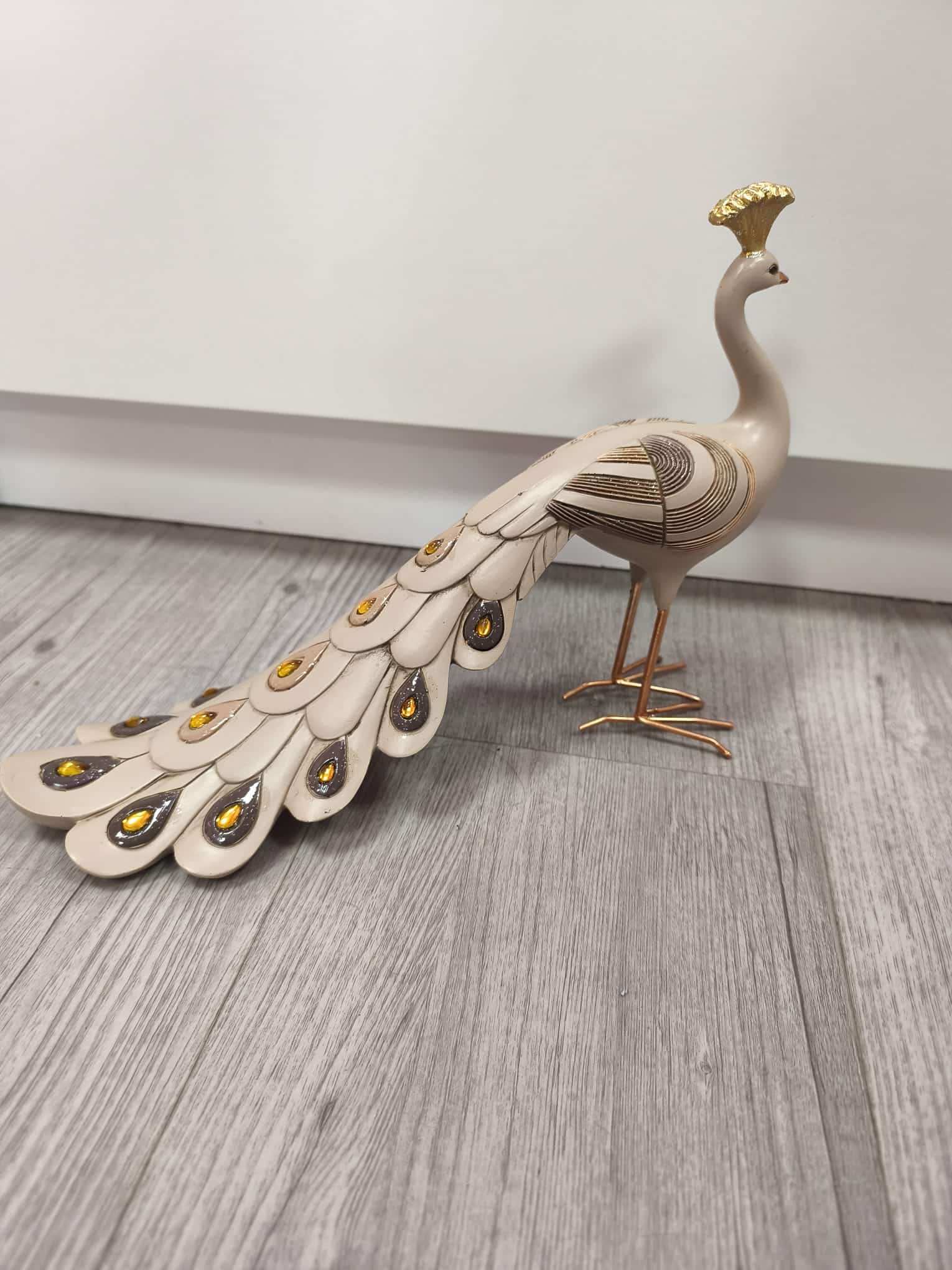 Aporta sofisticación y estilo a tu hogar con esta preciosa figura de pavo real. Su diseño refinado destaca por los delicados detalles en relieve y su elegante cola decorada con acabados brillantes en tonos dorados y ámbar, que captan la luz y aportan un toque exclusivo.