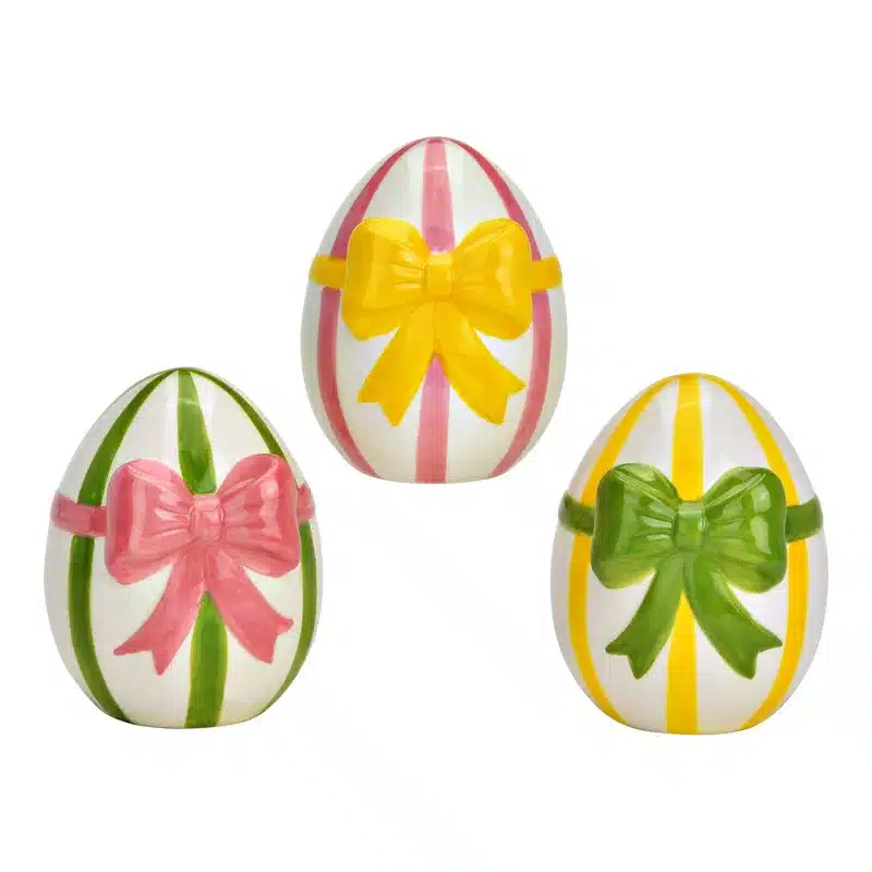 Dale un toque dulce y elegante a tu decoración con estos preciosos huevos de cerámica con lazo en relieve. Un detalle ideal para primavera, Pascua o para decorar cualquier rincón con encanto.