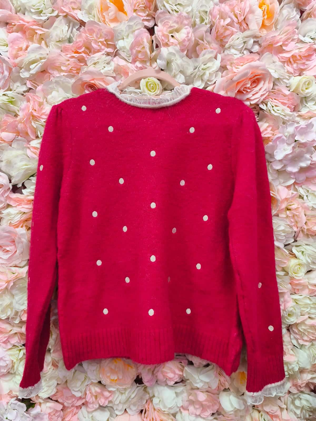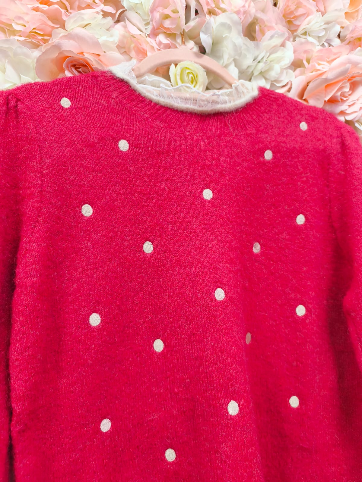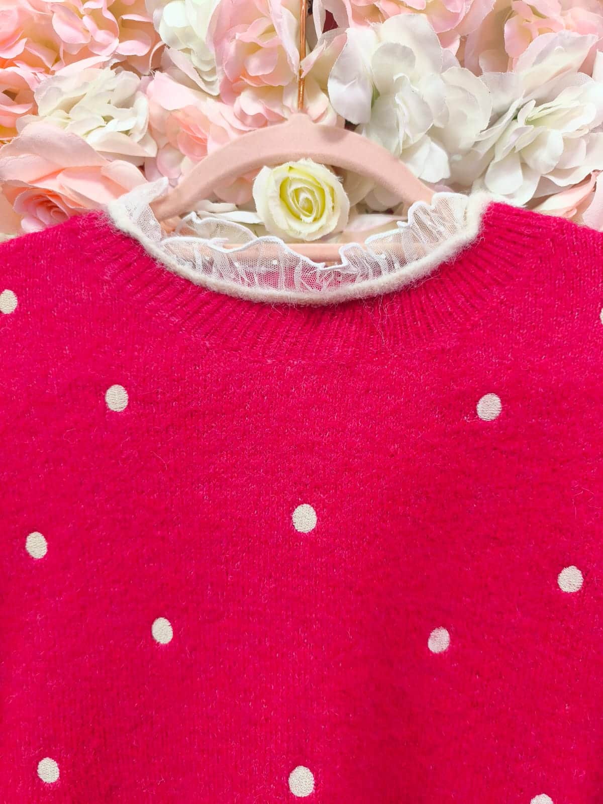 Jersey de punto suave en un vibrante tono fucsia, decorado con lunares en contraste que le aportan un aire femenino y divertido. Su detalle de cuello con volante de tul lo convierte en una prenda especial, ideal para quienes buscan algo diferente sin renunciar a la comodidad.