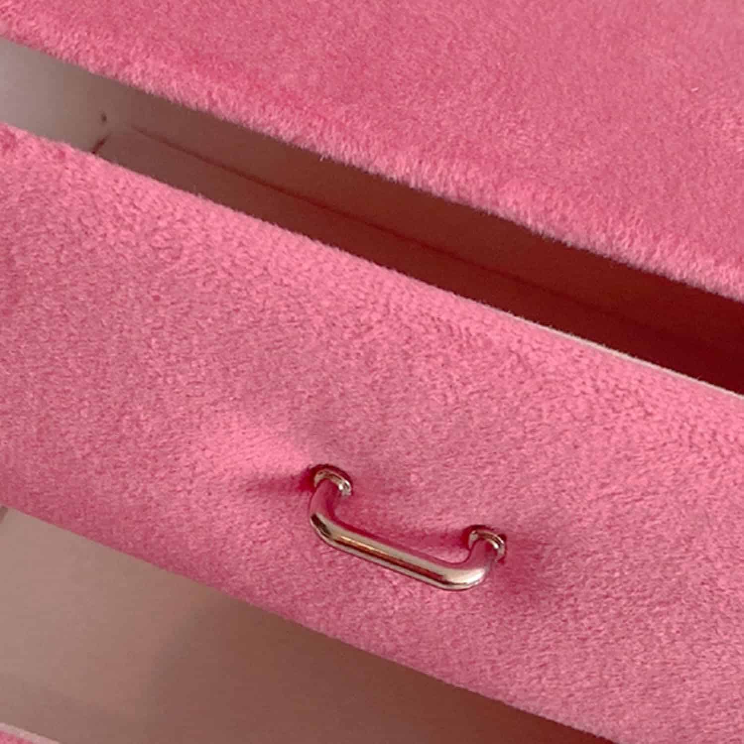 Organiza tus joyas con estilo con este precioso joyerito tipo tocador forrado en terciopelo rosa y con detalles dorados. Su diseño inspirado en la elegancia clásica lo convierte en una pieza decorativa única para tu tocador o dormitorio.