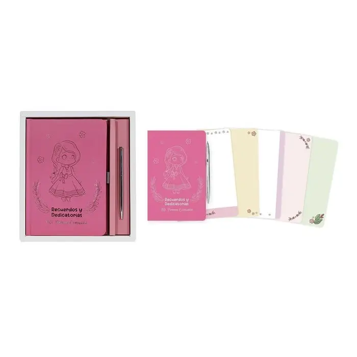 El set incluye un bonito cuaderno con páginas decoradas y un elegante bolígrafo, presentado en una caja ideal para regalo. Sus páginas permiten recoger firmas, mensajes y dedicatorias que se convertirán en un recuerdo inolvidable con el paso de los años.