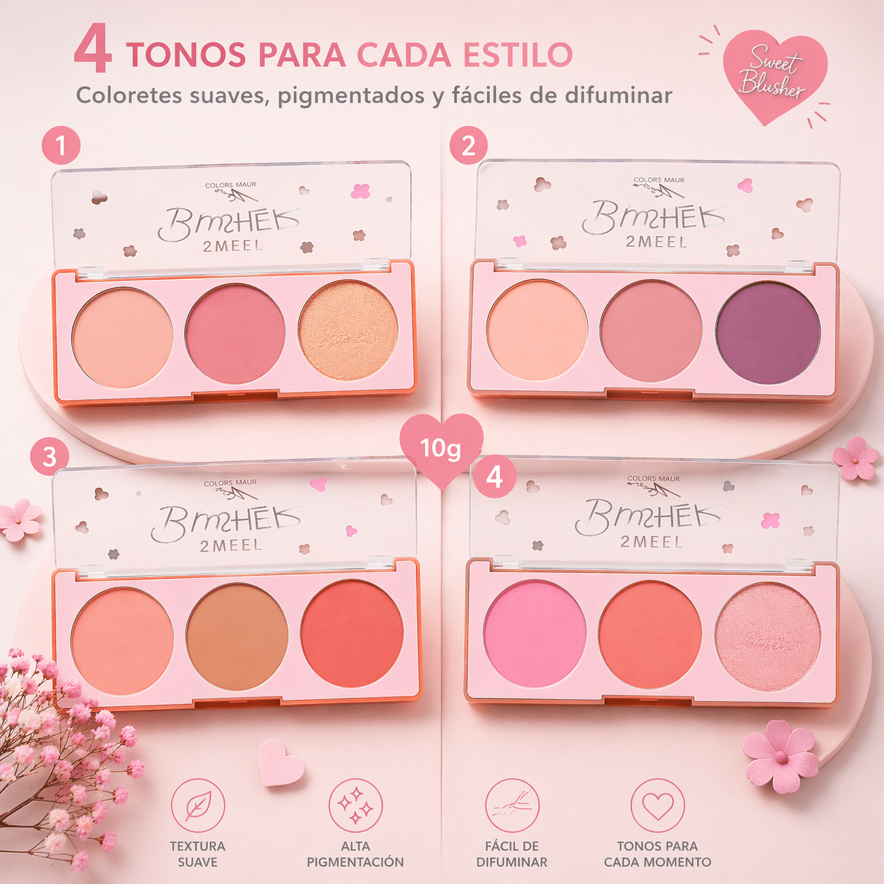 • 3 tonos por paleta (colorete + iluminador según modelo)