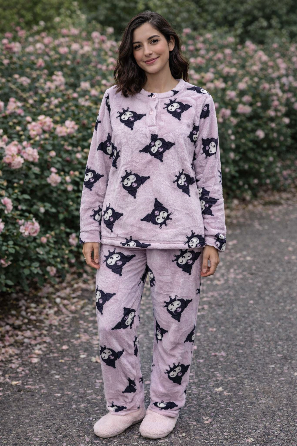El conjunto incluye parte superior y pantalón largos, ambos con el mismo estampado adorable sobre fondo rosa empolvado. Su tacto es mullido y agradable, envolviendo el cuerpo en una sensación de abrigo y bienestar desde el primer momento.