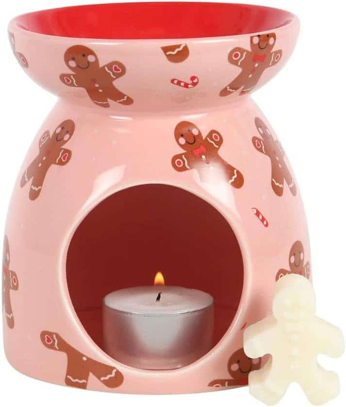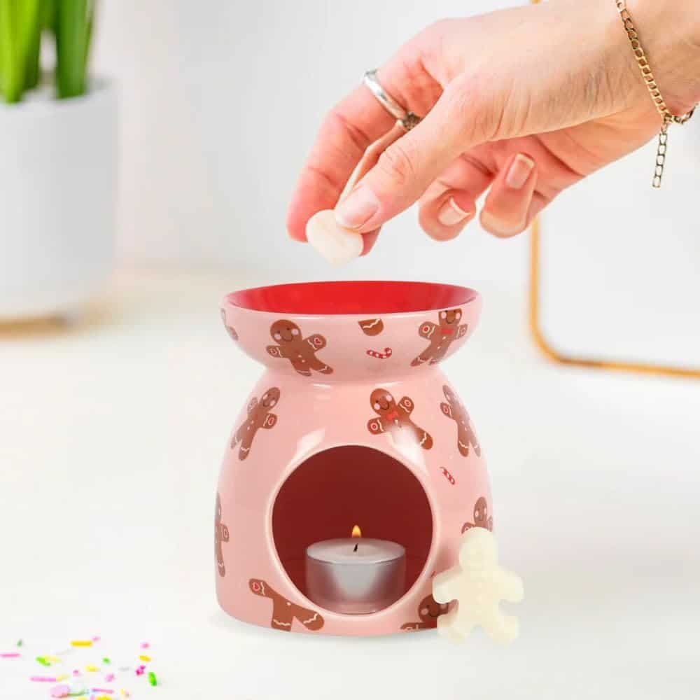 - Diseño navideño: un hombre de jengibre sonriente cubre este quemador de aceite de cerámica rosa y calentador de cera. Acentuado por pequeños bastones de caramelo y un cuenco rojo, este estilo festivo será un favorito para perfumar el hogar esta temporada de Navidad