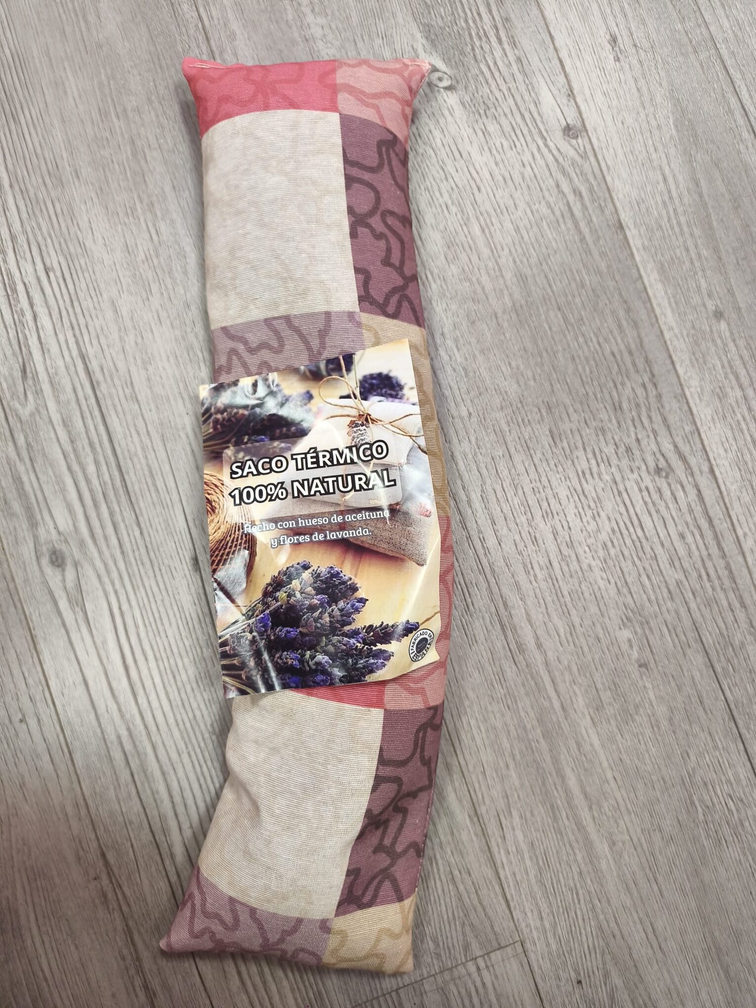 Saco térmico 100% natural, relleno de hueso de aceituna y flores de lavanda, ideal para aliviar molestias de forma natural y aportar una agradable sensación de bienestar gracias a su suave aroma relajante.
