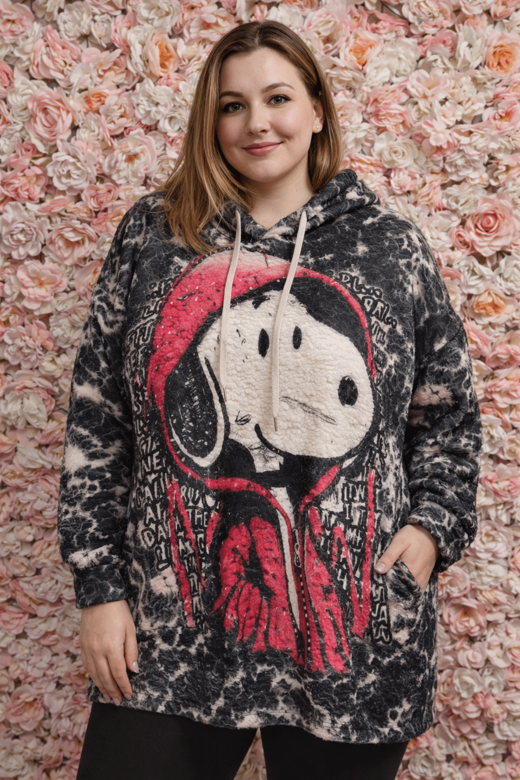 Su diseño largo estiliza y permite llevarla cómodamente con leggings o pantalones ajustados. El estampado frontal es el gran protagonista, aportando un toque urbano y desenfadado que no pasa desapercibido.