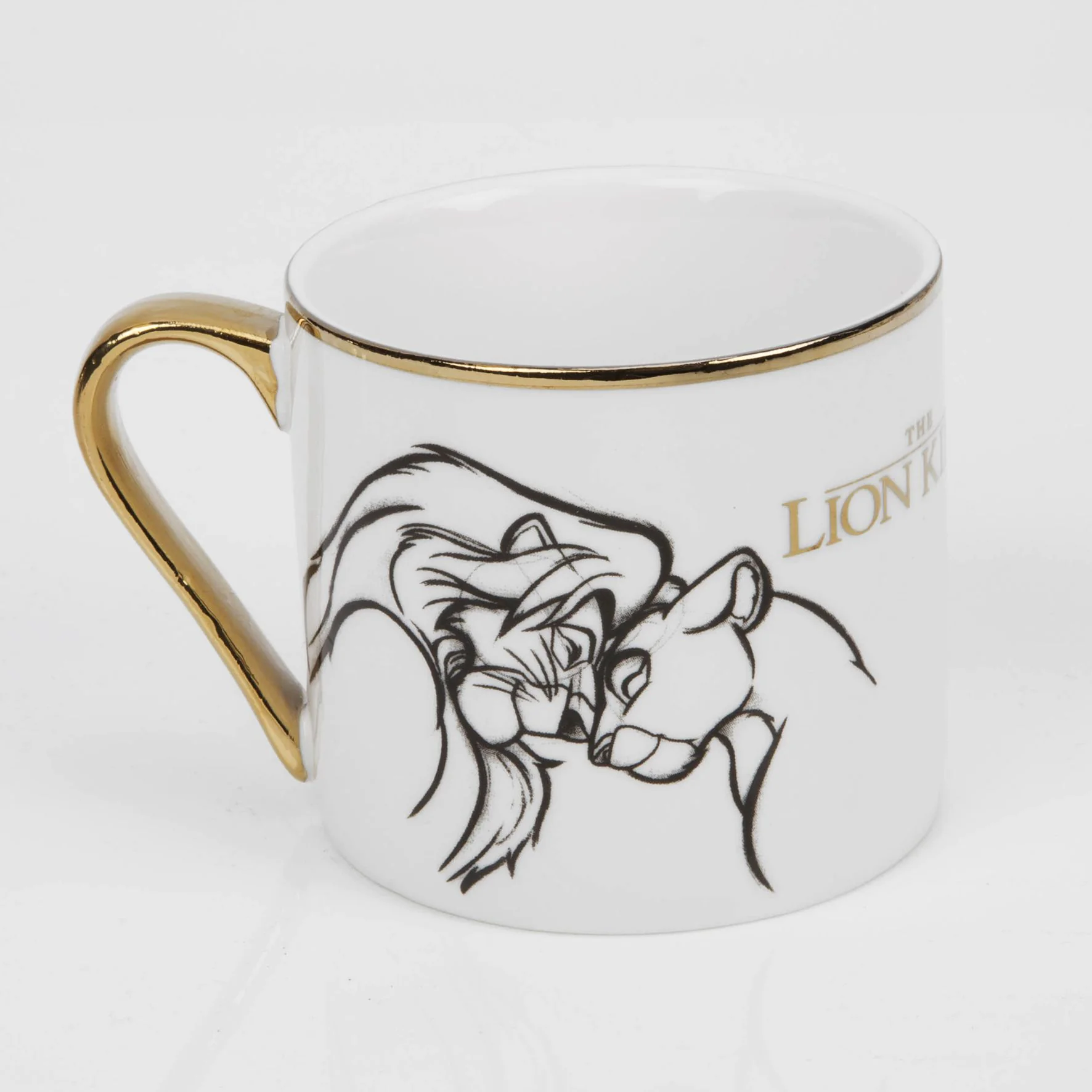 Una hermosa taza clásica de El Rey León con ilustración a lápiz, con asa y borde dorados y un detalle oculto de «El Rey León» en la base interior. Disney – Haciendo realidad los sueños desde 1923.