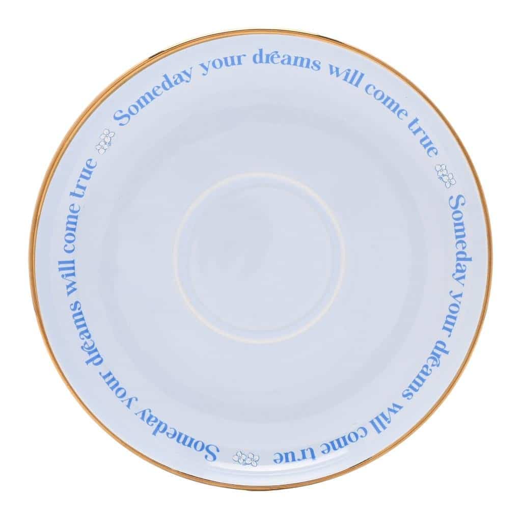 Este delicado servicio de porcelana presenta una caprichosa ilustración de la querida princesa entre motivos florales, con el texto «Sigue tus sueños».