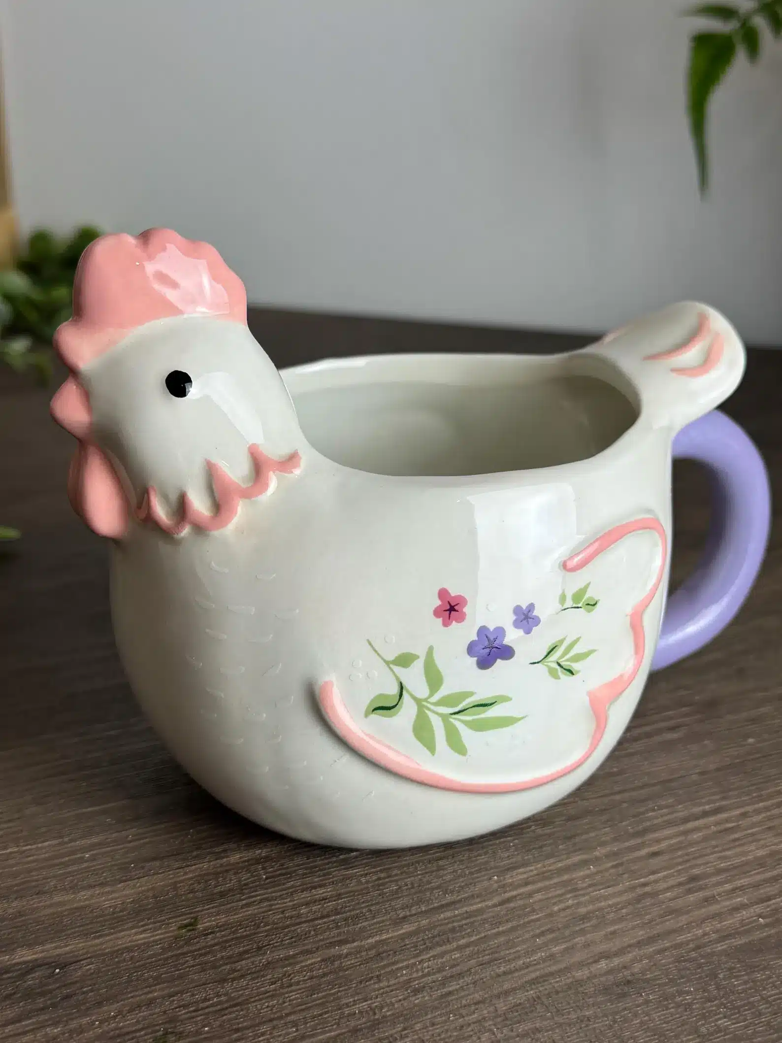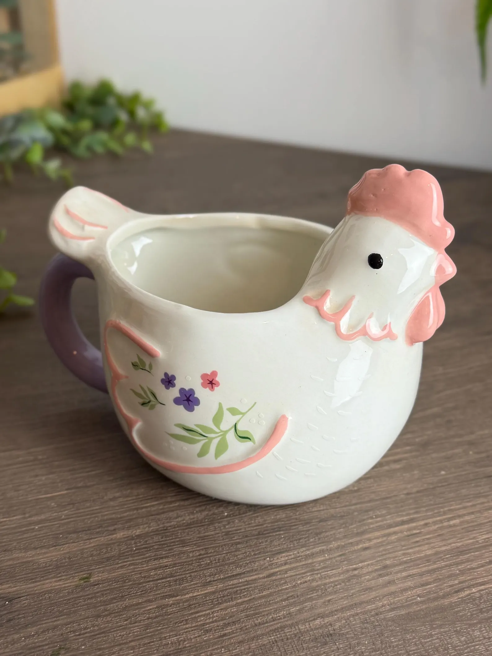 Esta taza de cerámica, con forma de gallina dulce y decorada con suaves flores en tonos pastel, es práctica y decorativa, lo que la convierte en un complemento encantador para cualquier cocina de estilo rural o campestre.