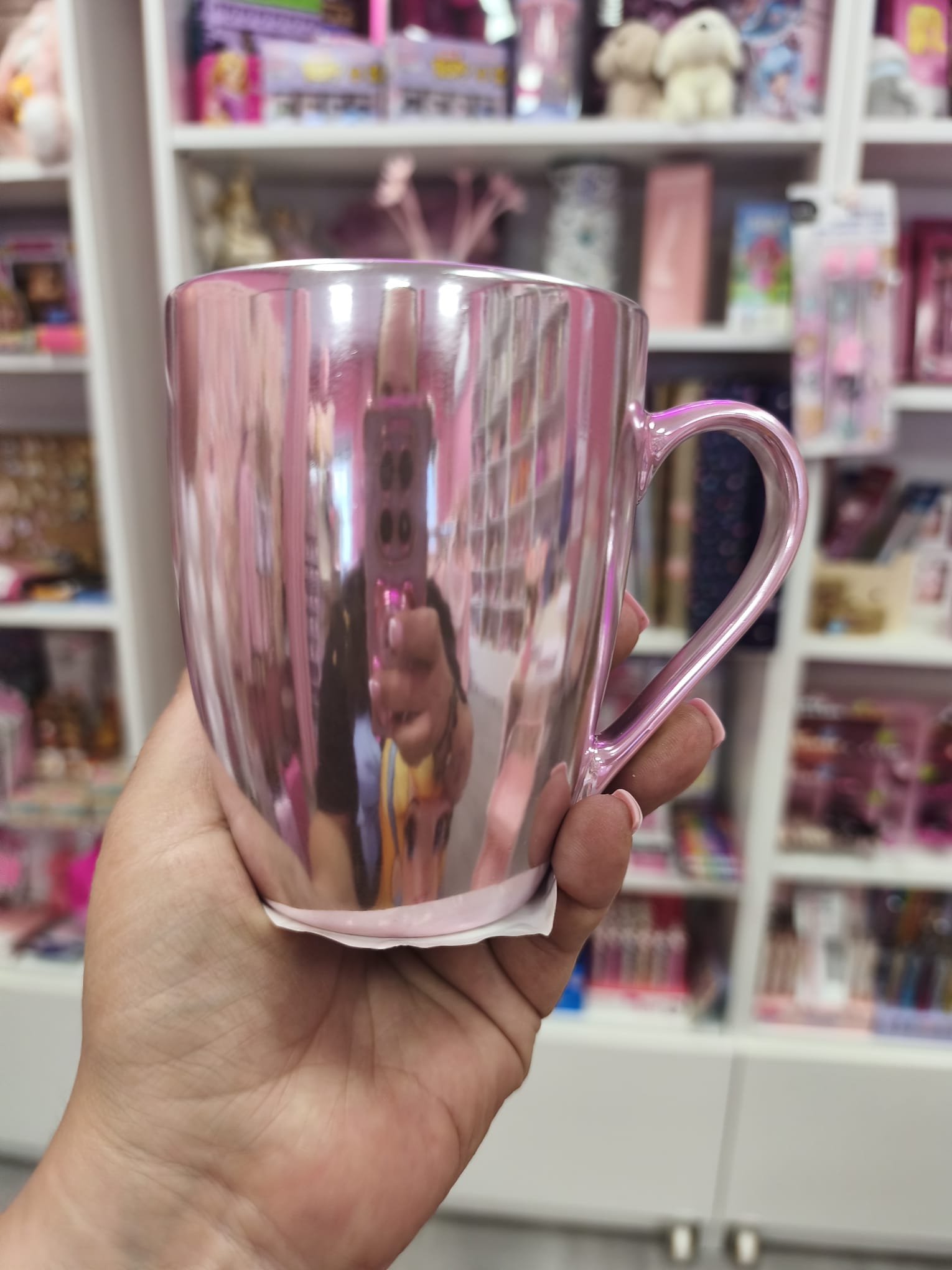 Dale un toque brillante y elegante a tus momentos de café o té con esta preciosa taza de acabado rosa perlado con efecto espejo. Su diseño moderno y llamativo la convierte en un detalle ideal tanto para uso personal como para regalar.