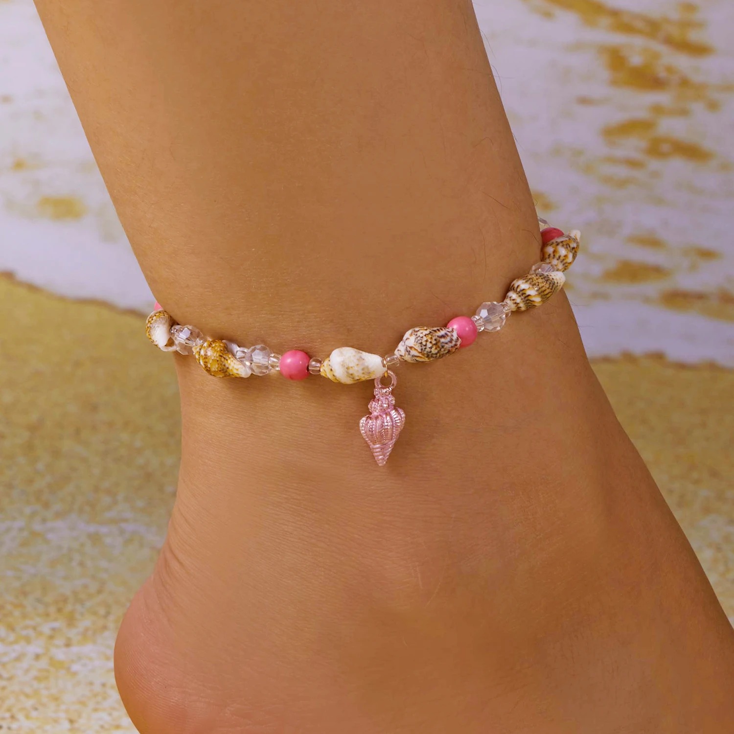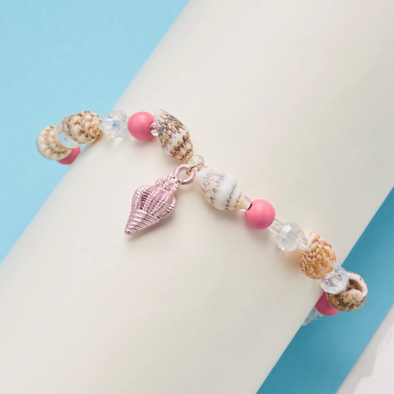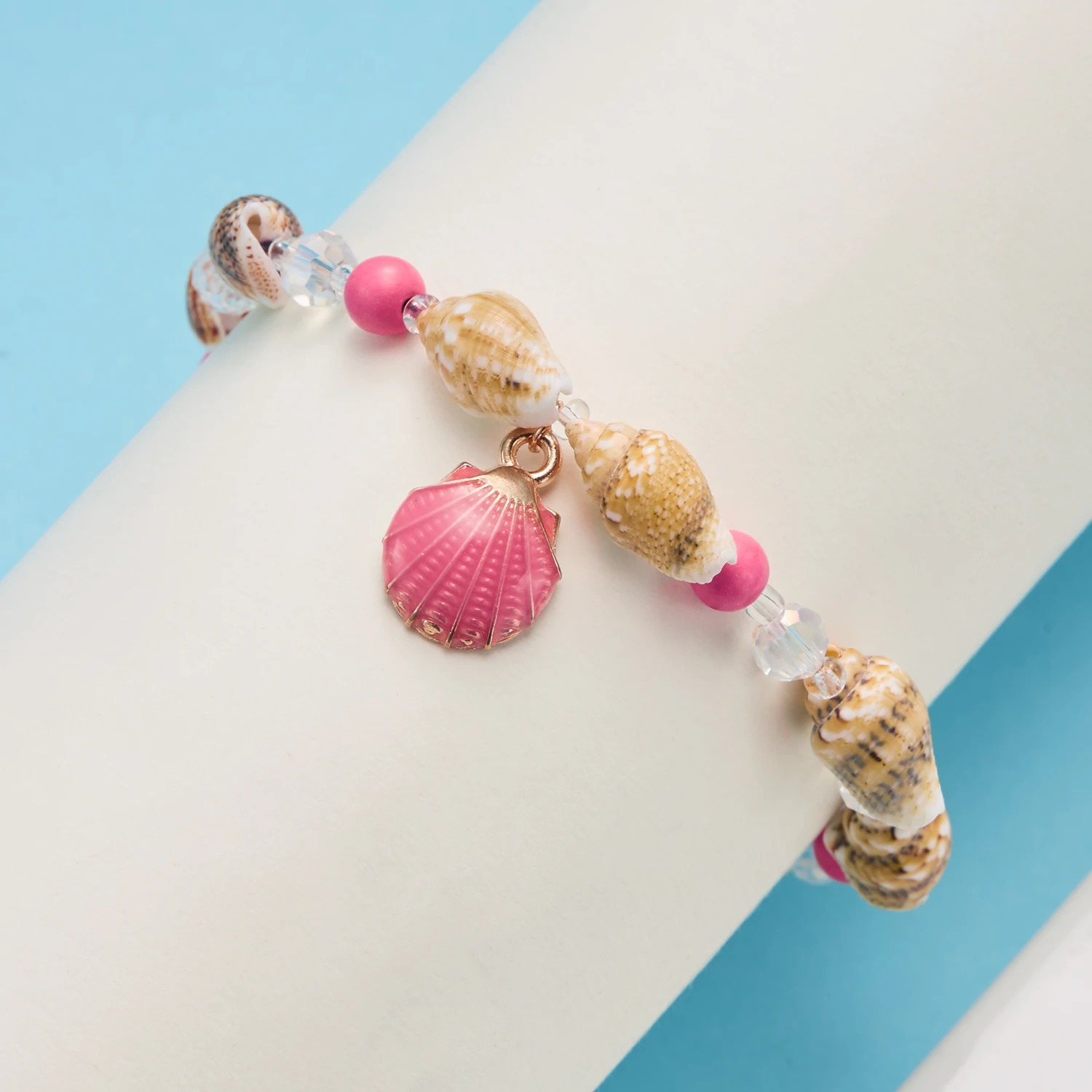 Una lleva un charm de concha rosa y la otra, una caracola en rosita claro.