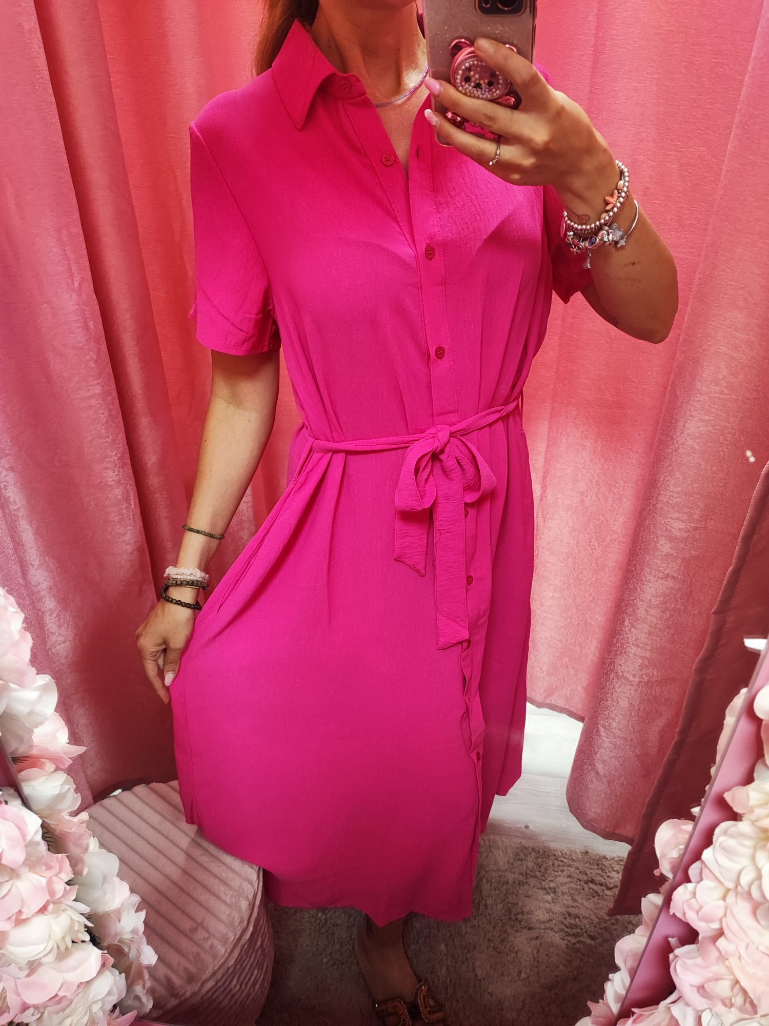 Luce elegante y cómoda con este vestido camisero en un vibrante tono fucsia que resalta tu estilo. Confeccionado en una tela ligera y fluida, ideal para cualquier ocasión, desde el día a día hasta eventos casuales.